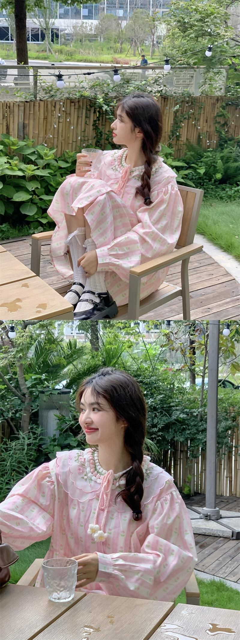 シックな花刺繍長袖ドレスの女性の秋 2023 新しい緩い甘いベビードールスカートショートスカート ロング レッド 大人ガーリー スウィート キュート カジュアル オータム 秋物 フラワーデザイン 0921959604594816