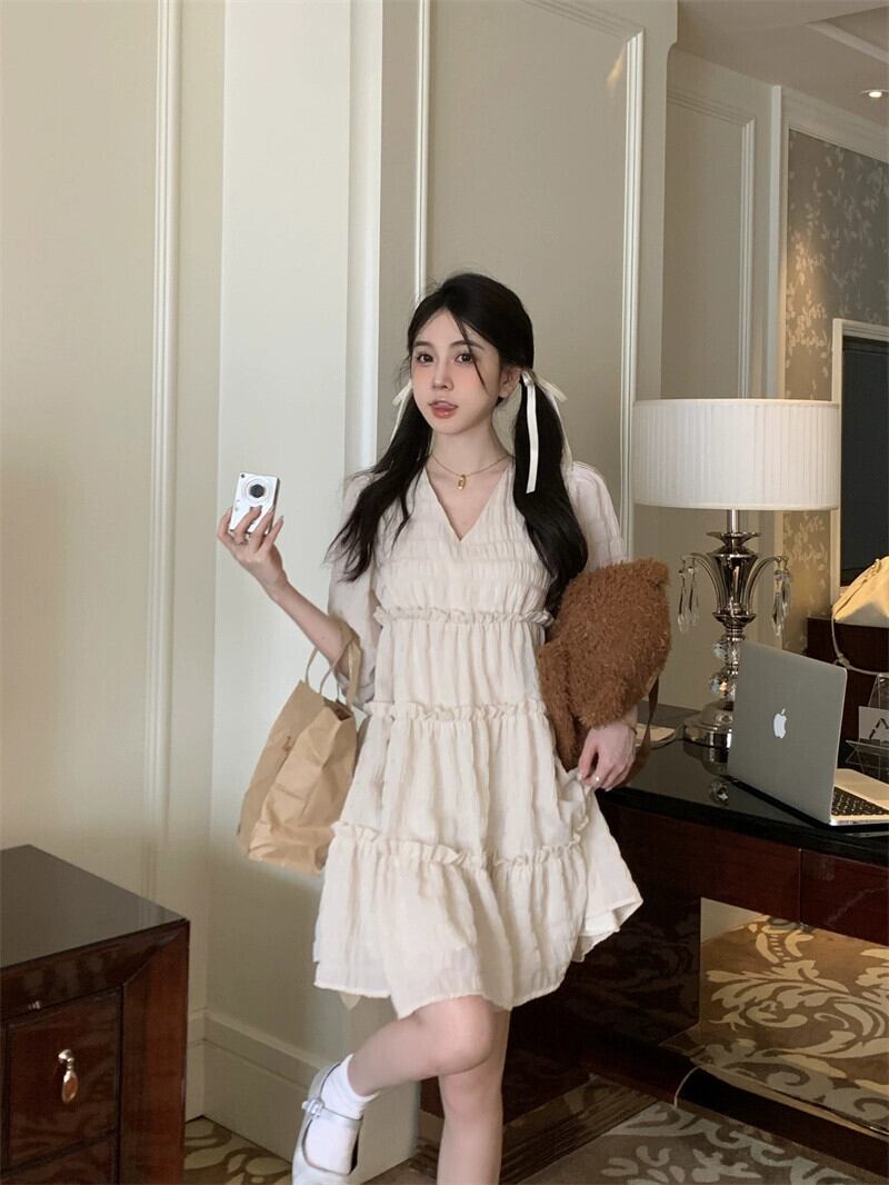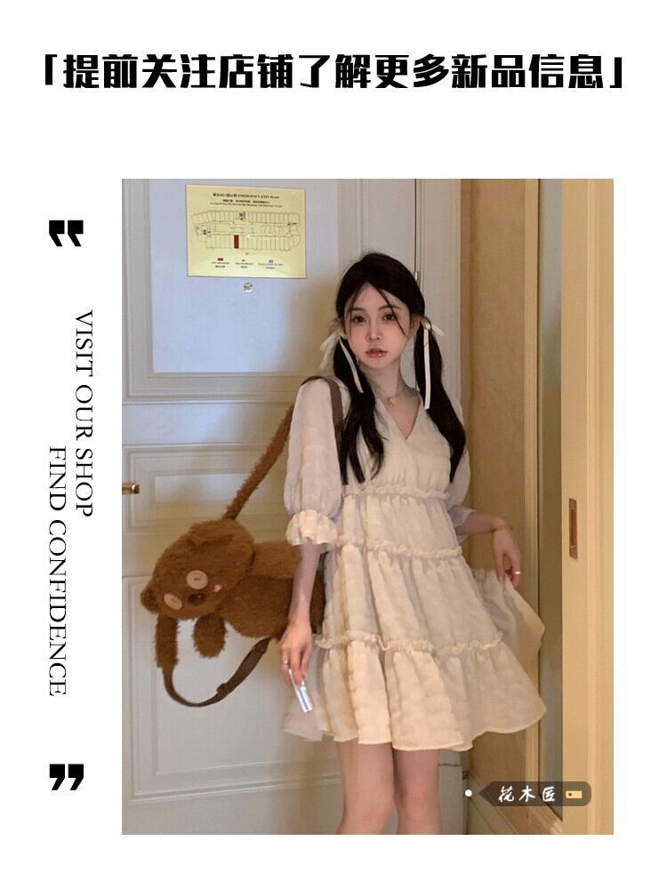 甘い V ネックパフスリーブドレス女性の夏 2023 純粋な欲望ルーズでスリムなボトムとショートスカート 大人ガーリー スウィート キュート カジュアル サマー 夏物 Vネック ピュア 0921961900527212