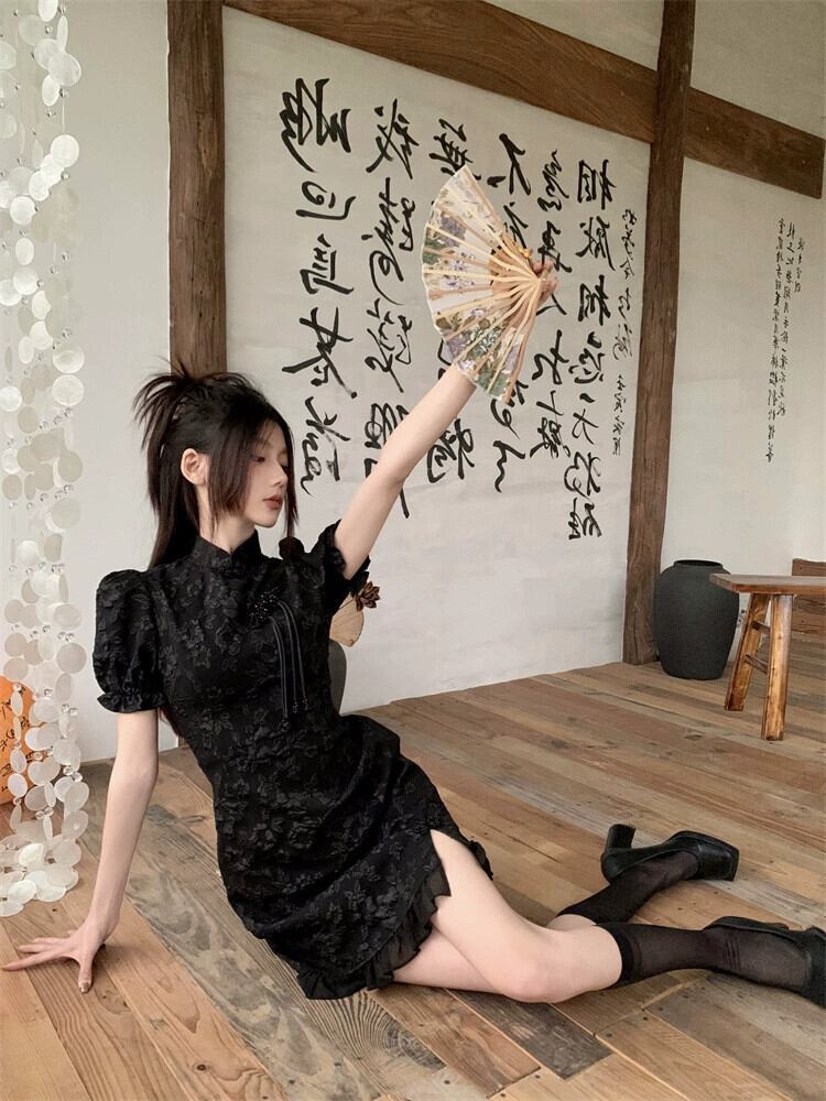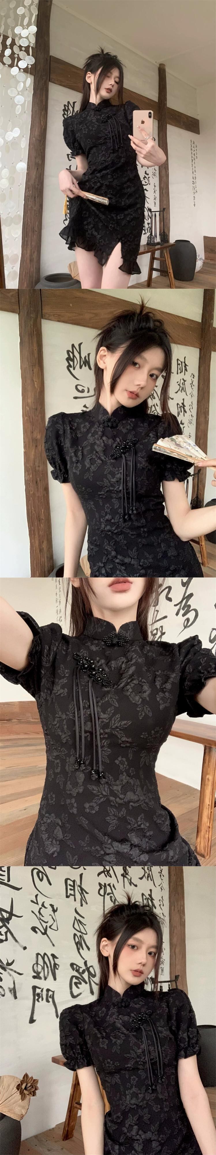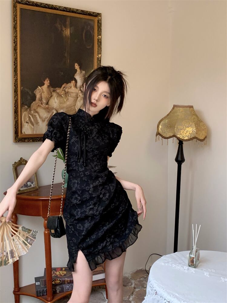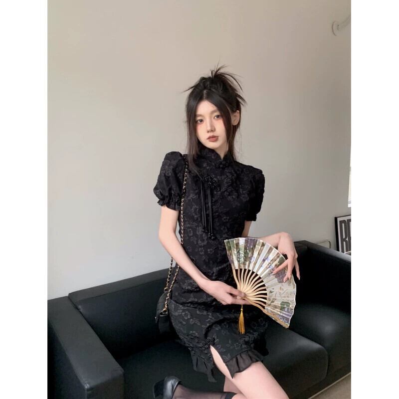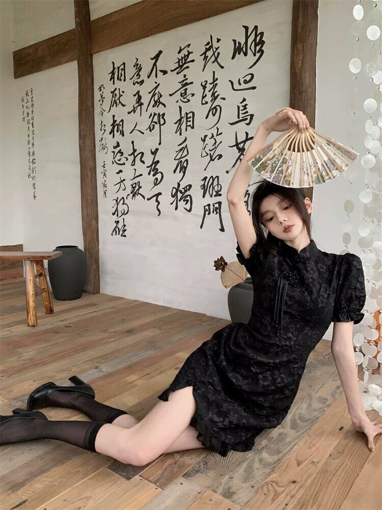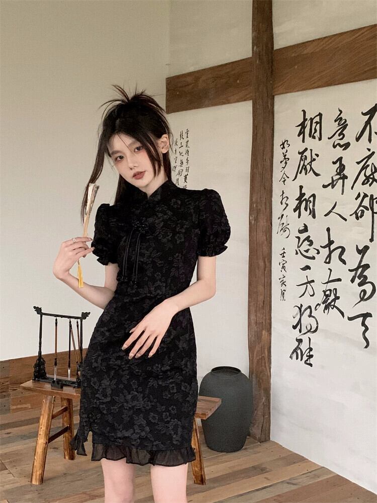 中国風改善チャイナドレスデザインドレス女性の夏 2023 新しいスタイルの気質スタンドカラーパフスリーブ A ラインスカート サマー 夏物 Aライン 0921968012163256