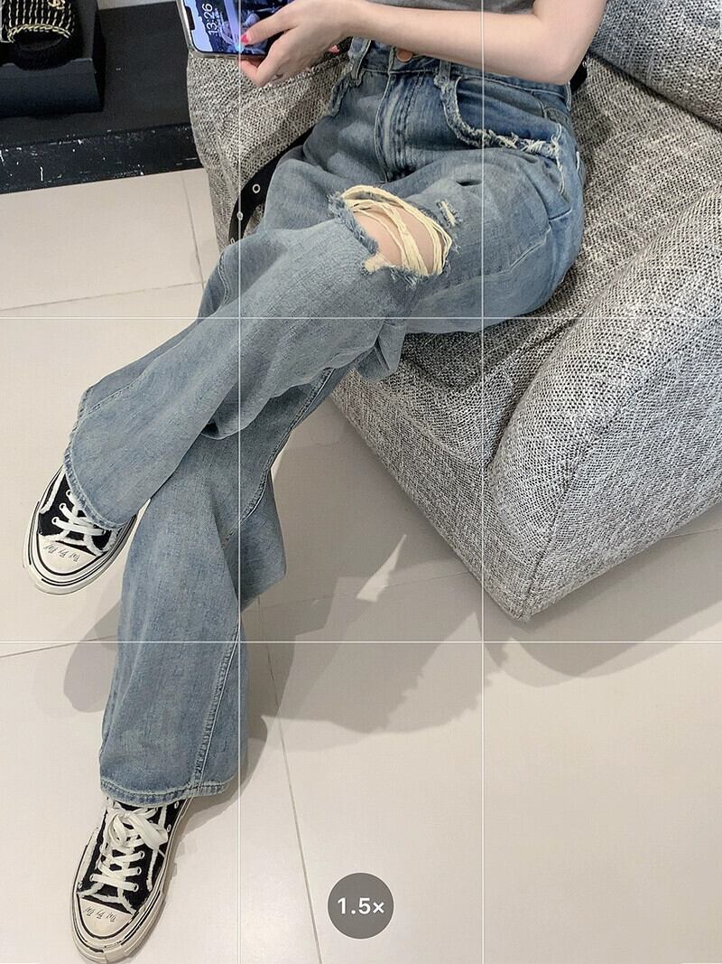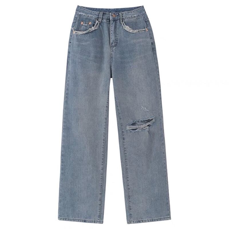 レトロなライトブルーのジーンズの女性、夏のハイウエストの破れたワイドレッグパンツ、ルーズな痩身パンツ、ストレートレッグパンツ、トレンディなパンツ サマー 夏物 0921938512199729