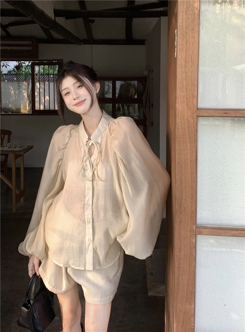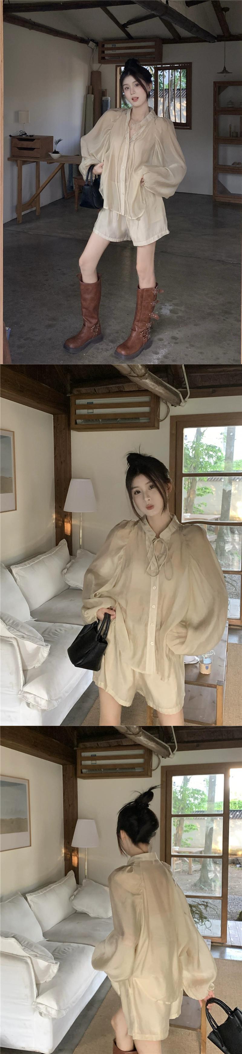 フランス製テンセルシャツスーツレディース、夏用長袖日焼け止めシャツ、スリミングワイドレッグショーツ、スタイリッシュな2点セット ロング サマー 夏物 ブルマー 0921914956033712