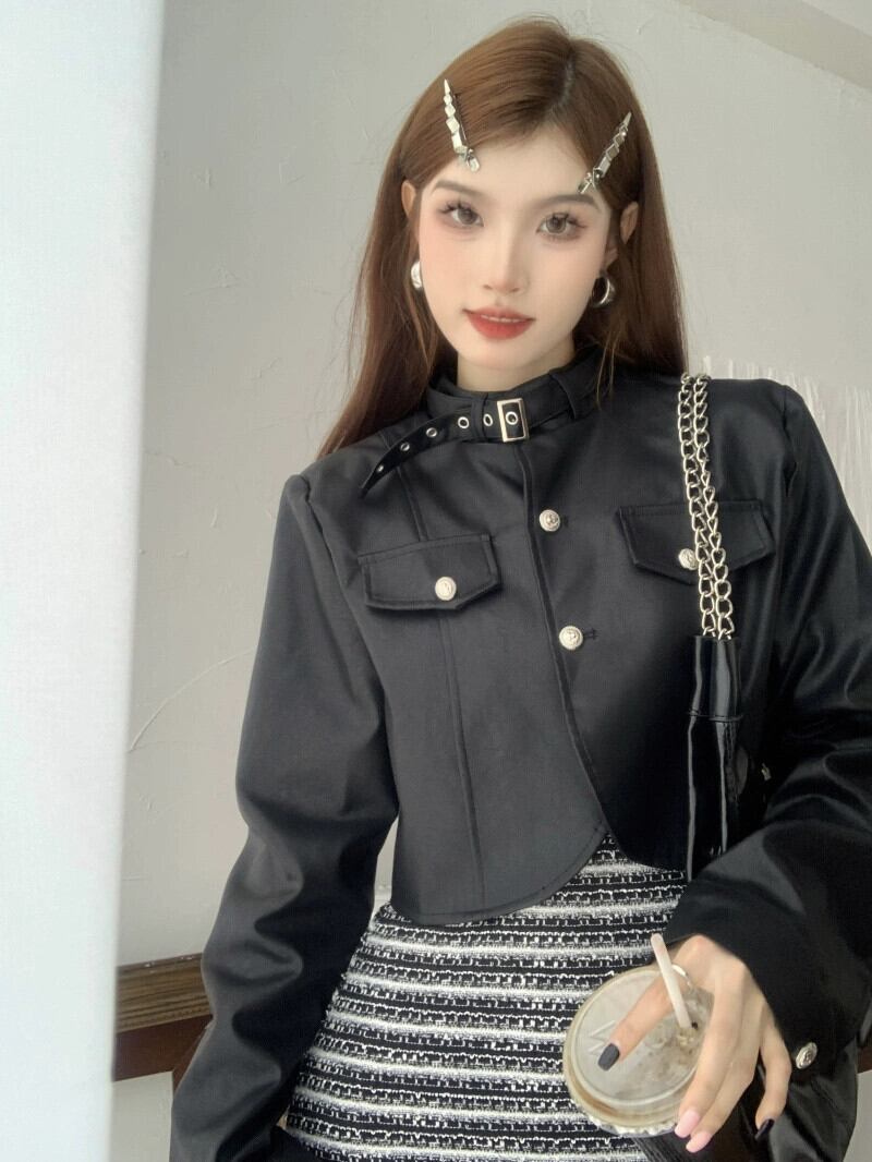 アメリカンクールスタイルブラックレザージャケット女性の秋の気質ハイエンドジャケットデザインショルダーパッドショートトップ オータム 秋物 0921922314473419