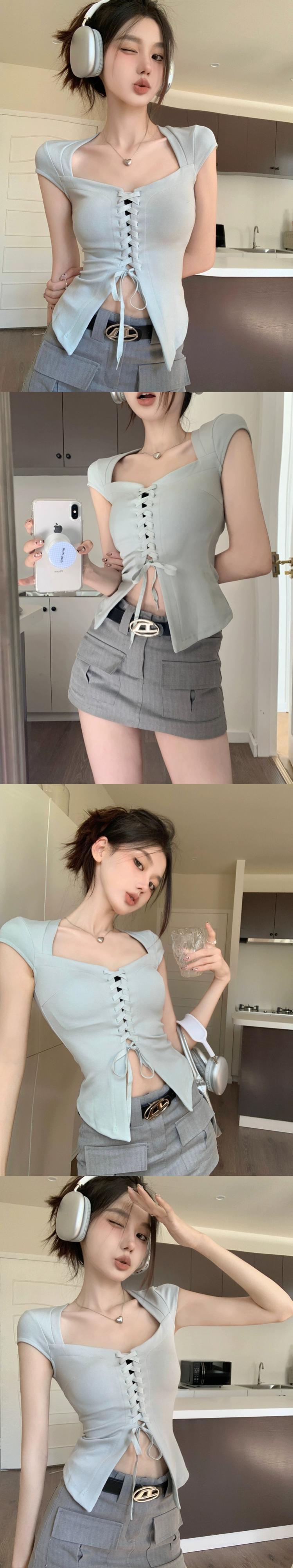 セクシーなストラップタイトフィットスクエアネック半袖 Tシャツ女性夏デザインスリットウエスト痩身ショートトップ サマー 夏物 スクウェア 0921991227606601
