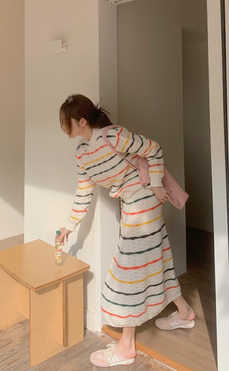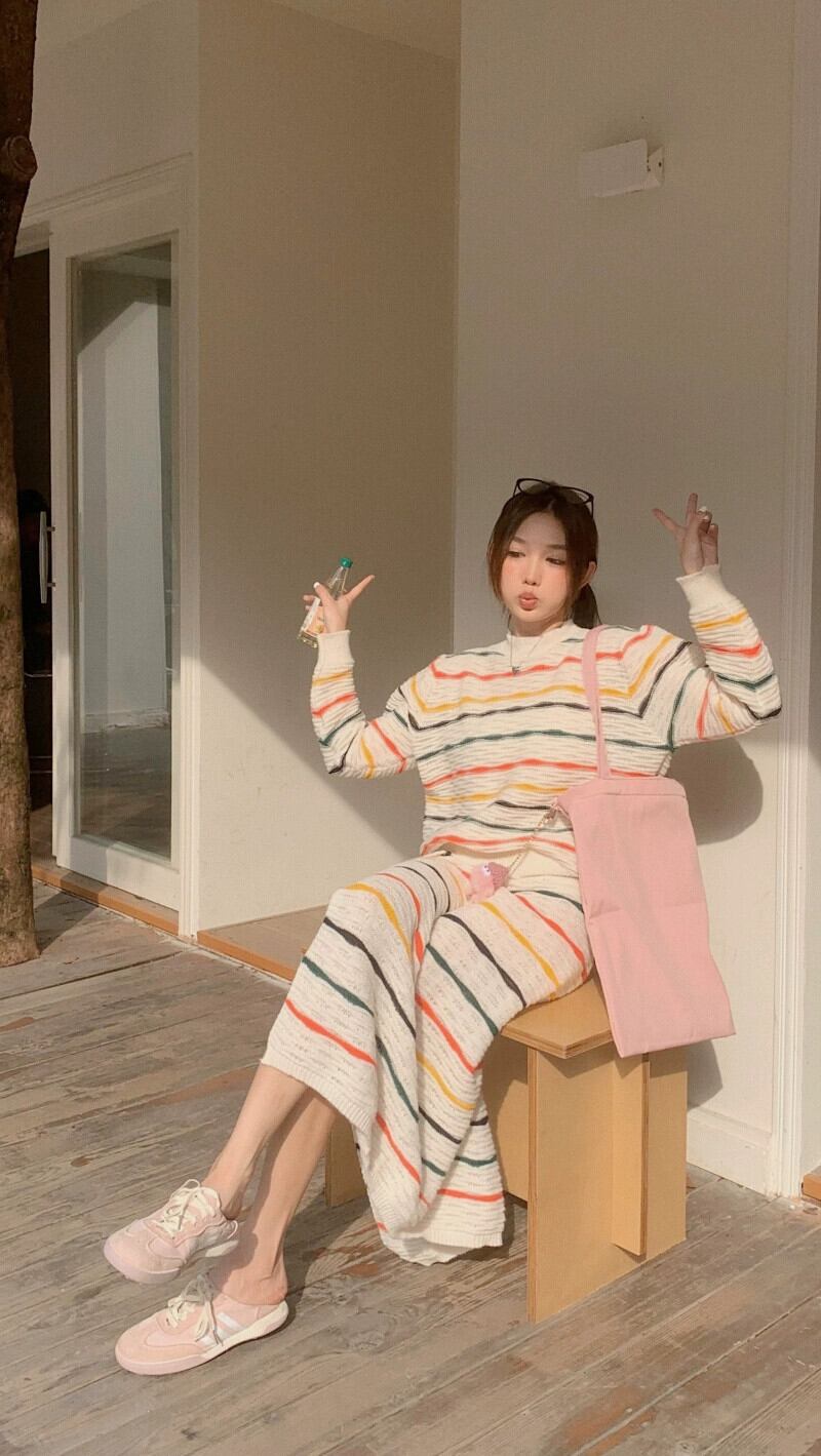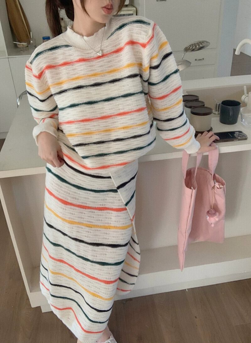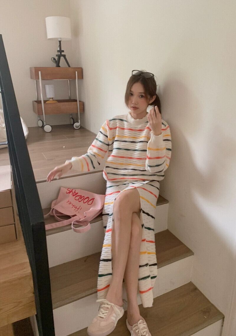 甘い年齢を軽減する万能スーツ女性 2023 秋の新しいレインボーストライプトップスリットスカートニット 2 点セット 大人ガーリー スウィート キュート カジュアル オータム 秋物 0921967205020179