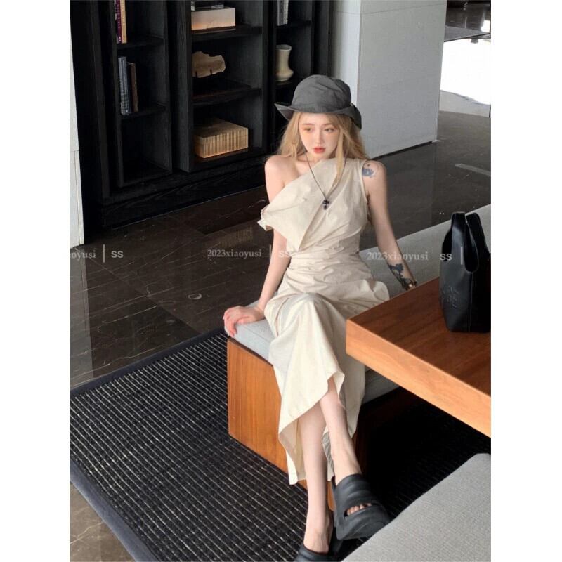 ニッチデザイン斜め肩ノースリーブドレス女性の夏の 2023 新しいスタイルプリーツウエスト痩身シックなロングスカート サマー 夏物 0921916082786115