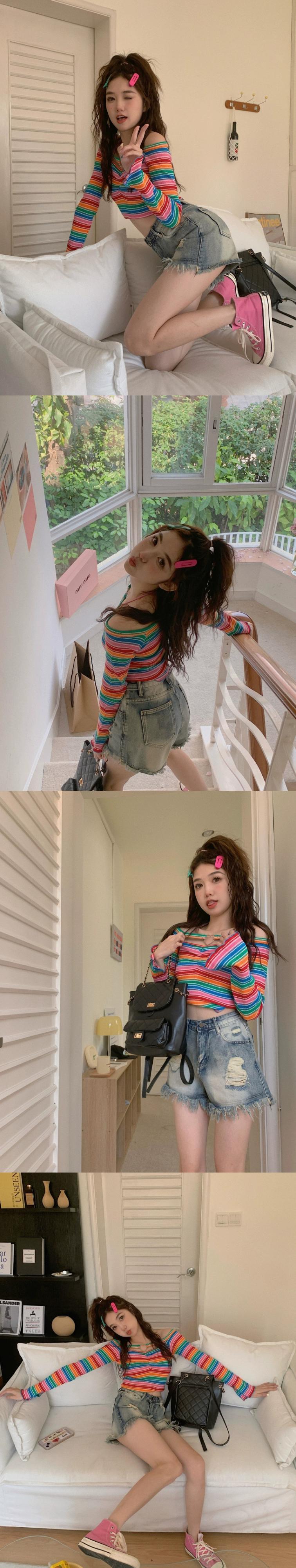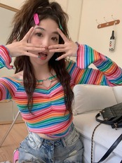 Sweet Hot Girl Love ワンライン襟長袖 Tシャツ女性の秋 2023 レインボーストライプショートボトムトップ ロング 大人ガーリー スウィート キュート カジュアル オータム 秋物 0921961715436737