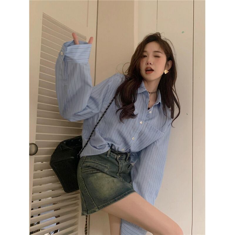 スタイルポロカラーストライプ長袖シャツ女性夏ブルールーズデザインニッチシャツミッドレングストップ ロング サマー 夏物 0921950913041941