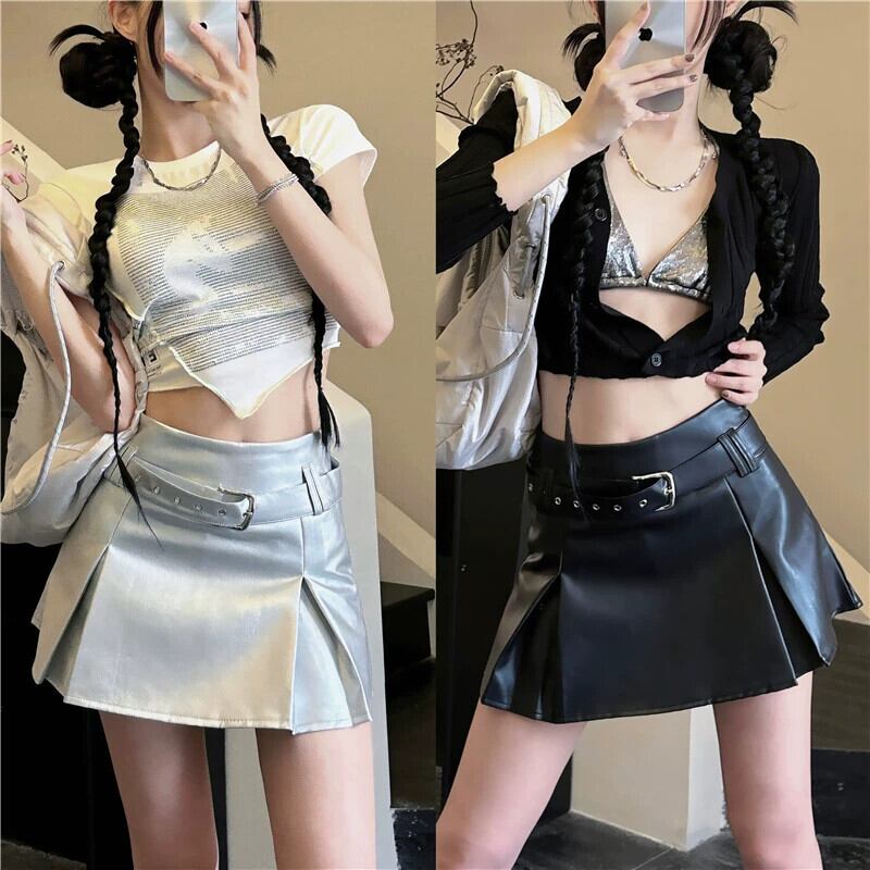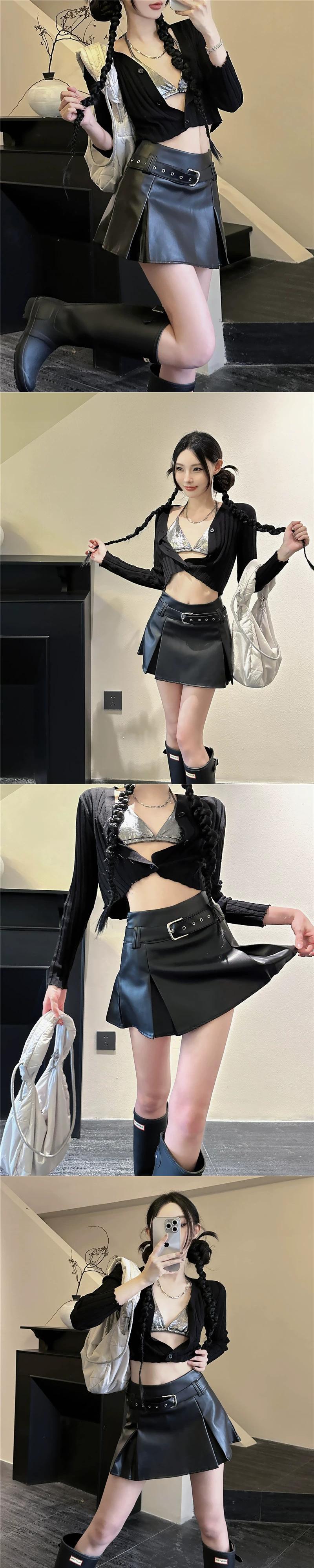 秋の黒のプリーツスカートの女性、露出防止キュロット、小さな革のスカート、ハイウエストのAラインスカート、ショートスカート ブラック オータム 秋物 レザー 09219561228518
