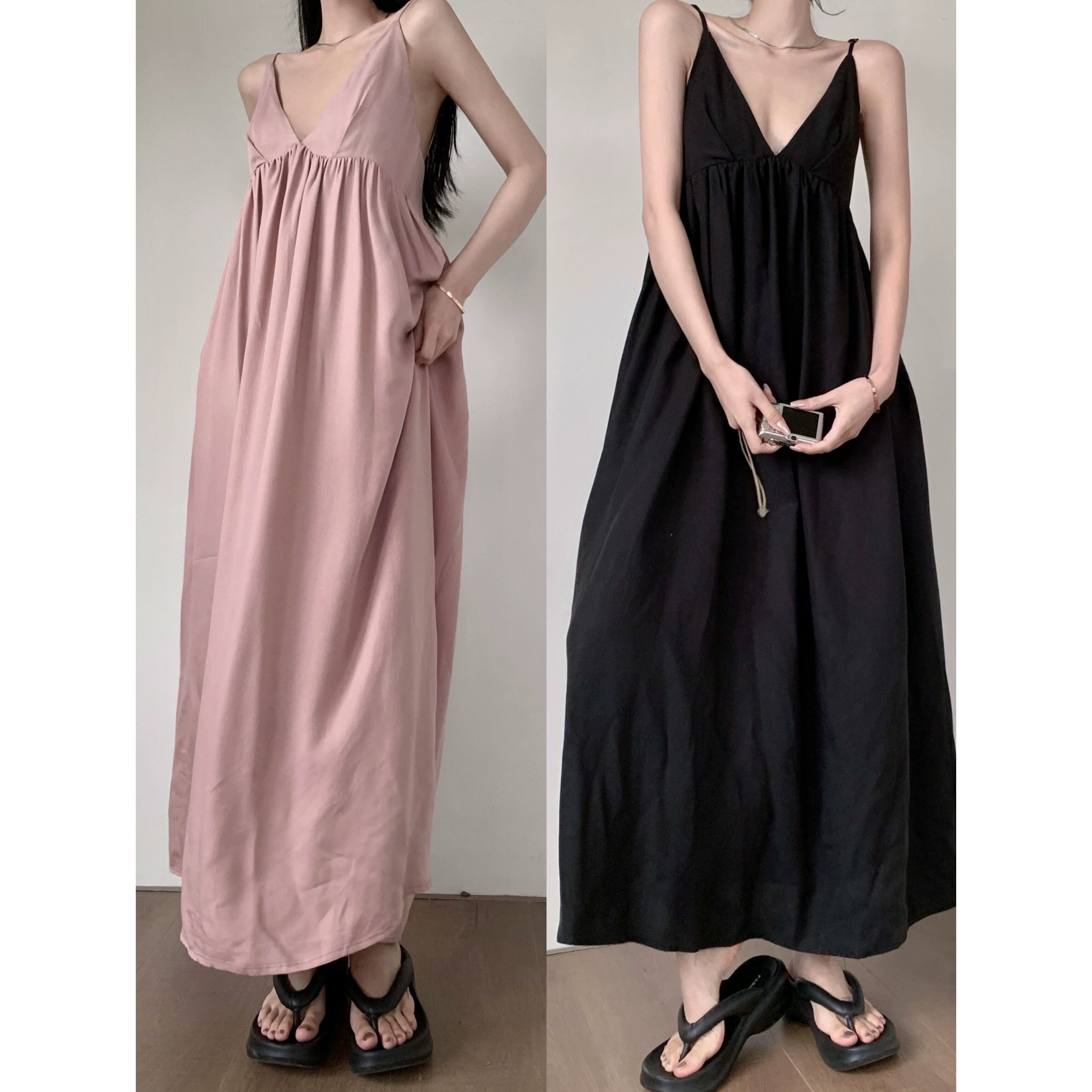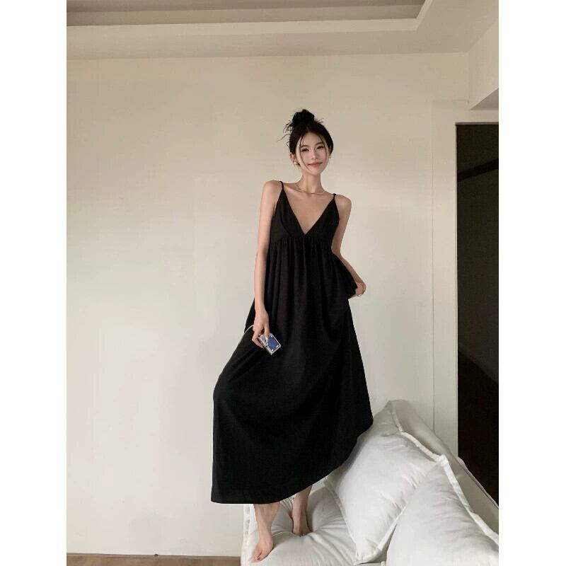 ヘップバーンスタイル V ネックサスペンダードレス女性の夏の 2023 新しい黒ロングスカートウエストと気質ノースリーブスカート ブラック サマー 夏物 Vネック 0921934455146697