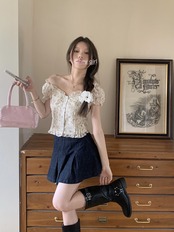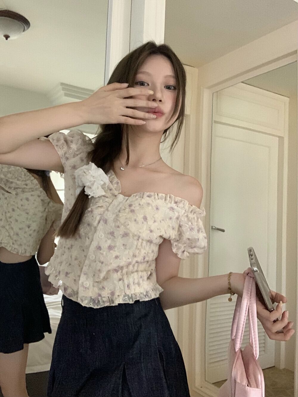 フランス製ワンショルダー花柄パフスリーブシャツレディース、サマーデザインニッチシャツ、シックなウエストショートトップ 夏物 0921962090585558