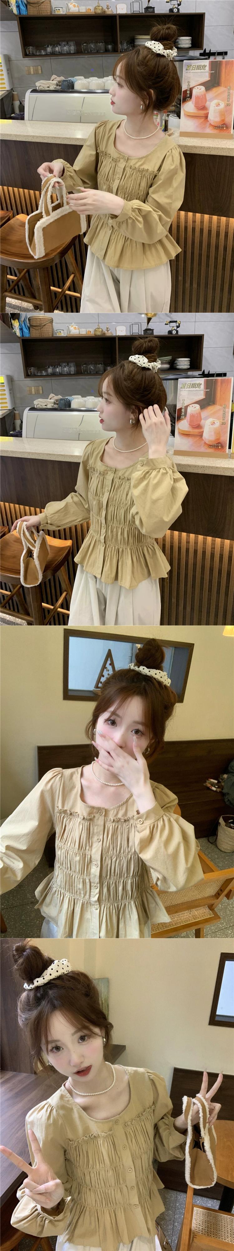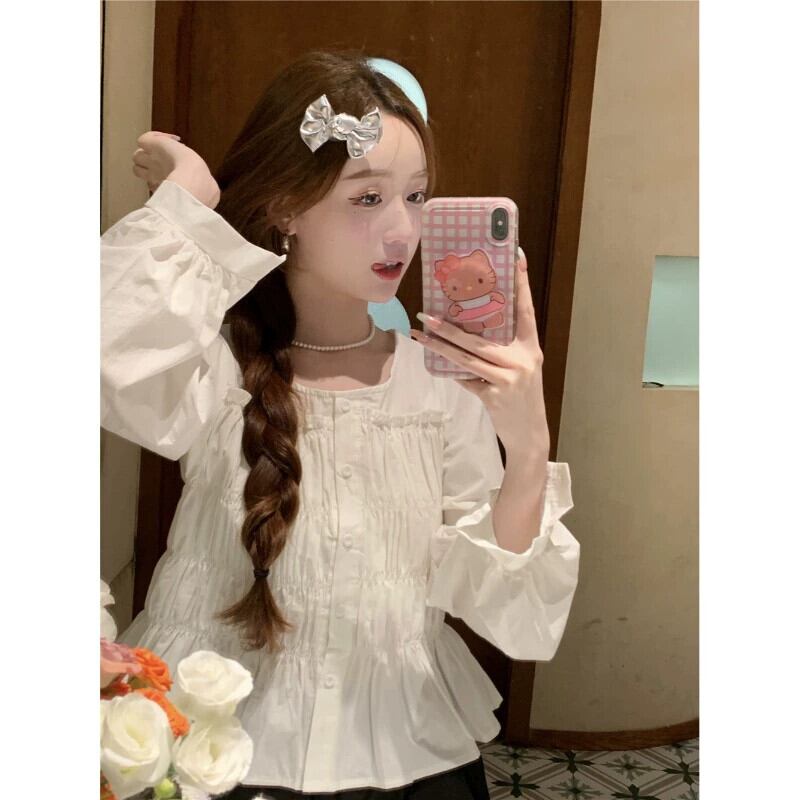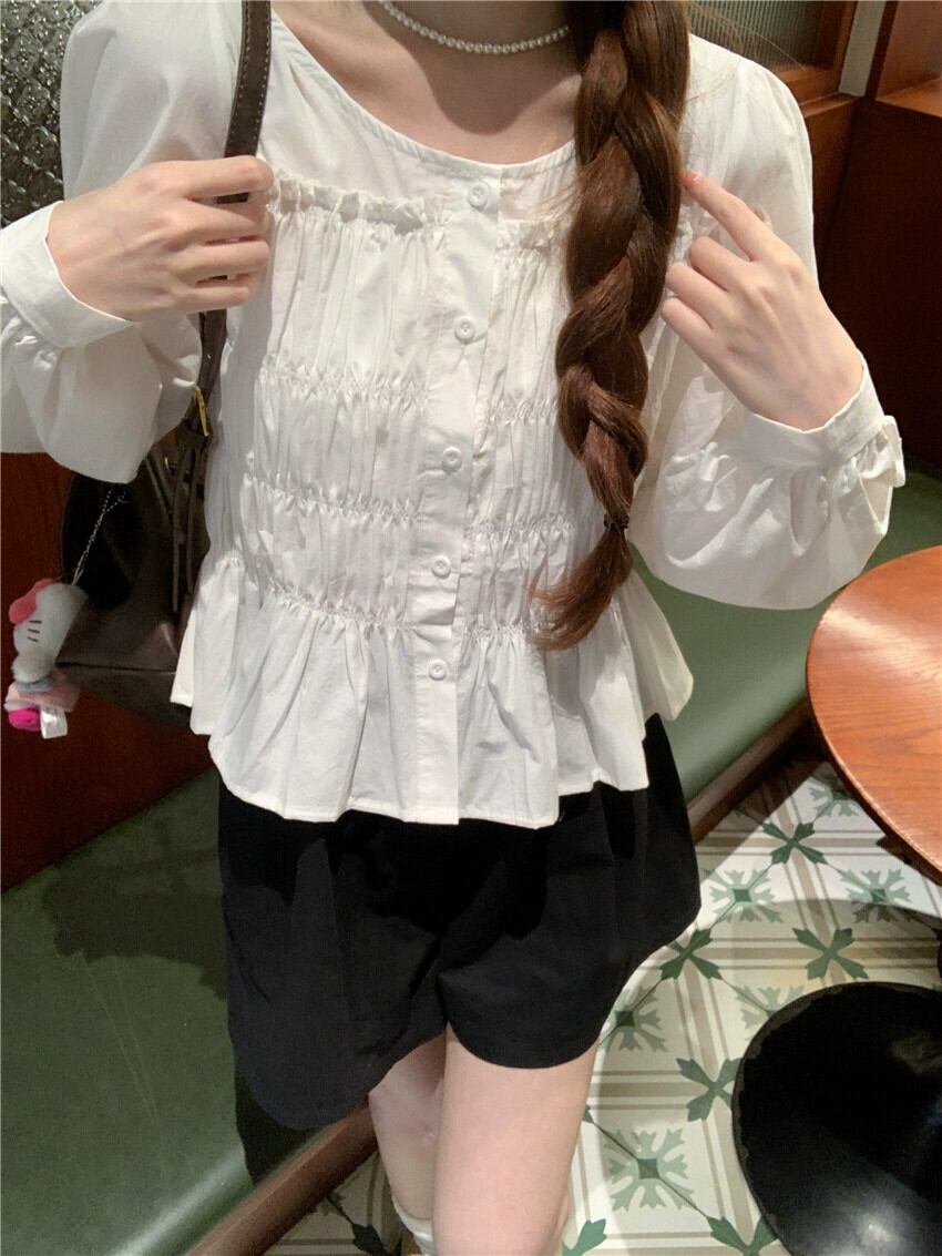 フランスの年齢を軽減するラウンドネック無地長袖シャツの女性の秋 2023 新しいプリーツ痩身甘い多用途ドールシャツ ロング 大人ガーリー スウィート キュート カジュアル オータム 秋物 Oネック ソリッドカラー 0921959122883395