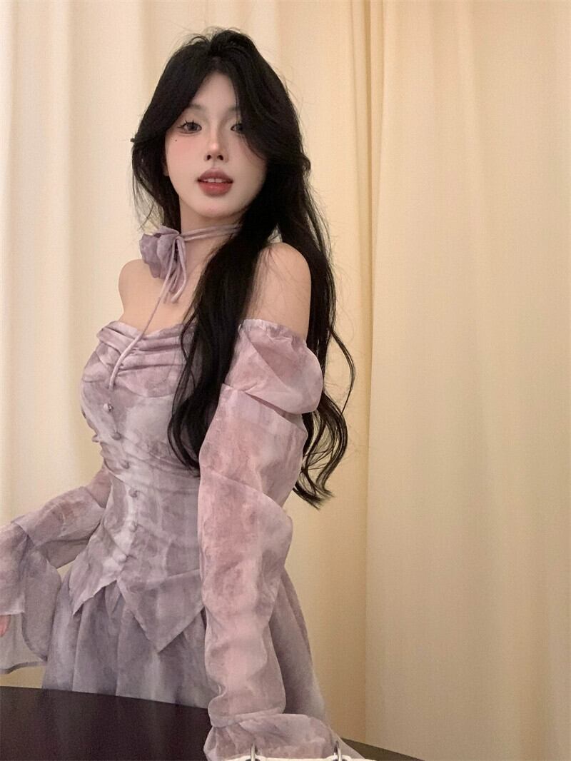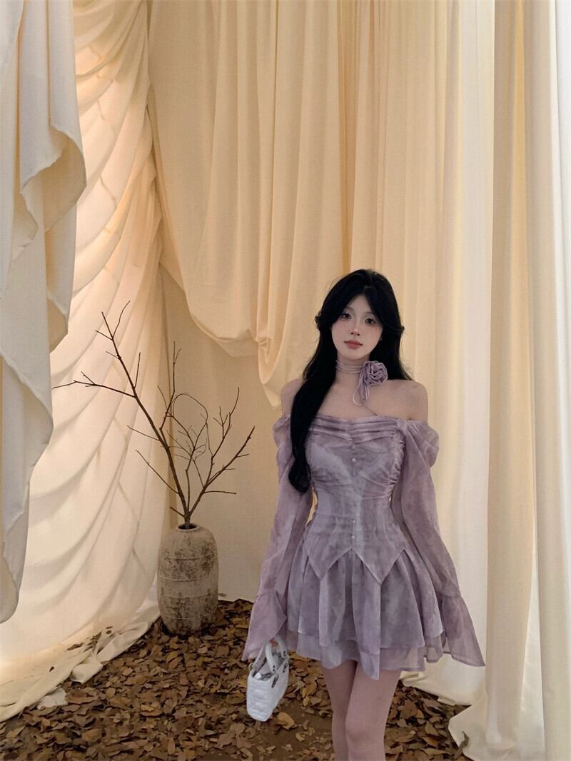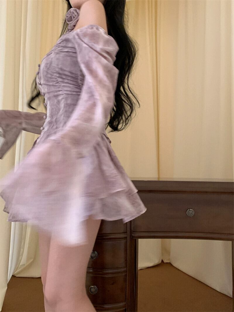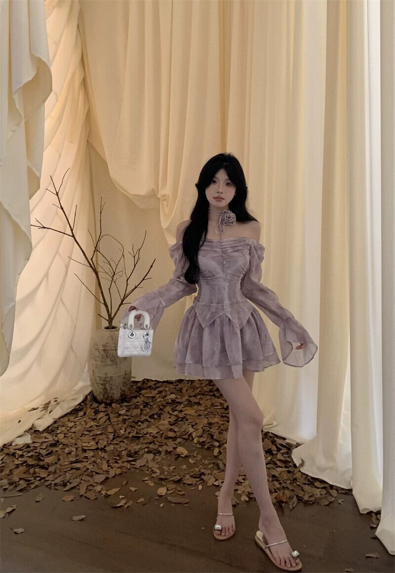 純粋な欲望のハイエンドハロー染めスクエアネックドレス女性 2023 秋の新しいスタイルのベルスリーブウエスト痩身ショートスカート オータム 秋物 スクウェア 0921998039641913