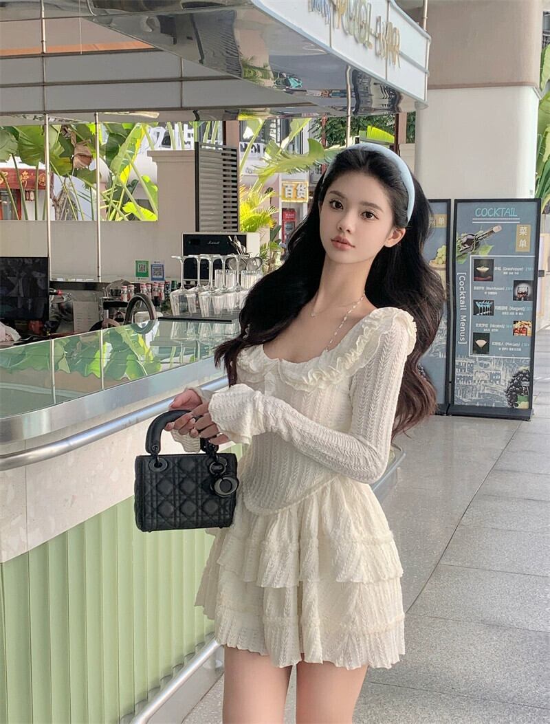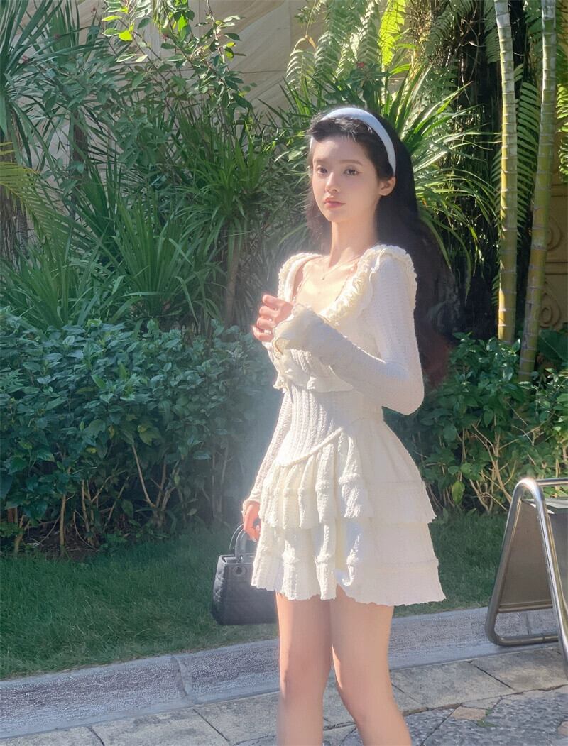 純粋な欲望甘いスタイルフリル長袖ドレスの女性の夏 2023 新しいスタイルウエスト痩身ショートケーキスカート ロング 大人ガーリー スウィート キュート カジュアル サマー 夏物 0921929882755117