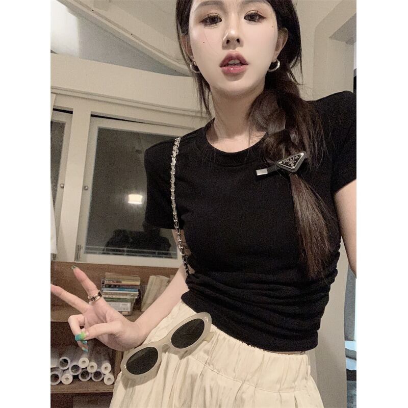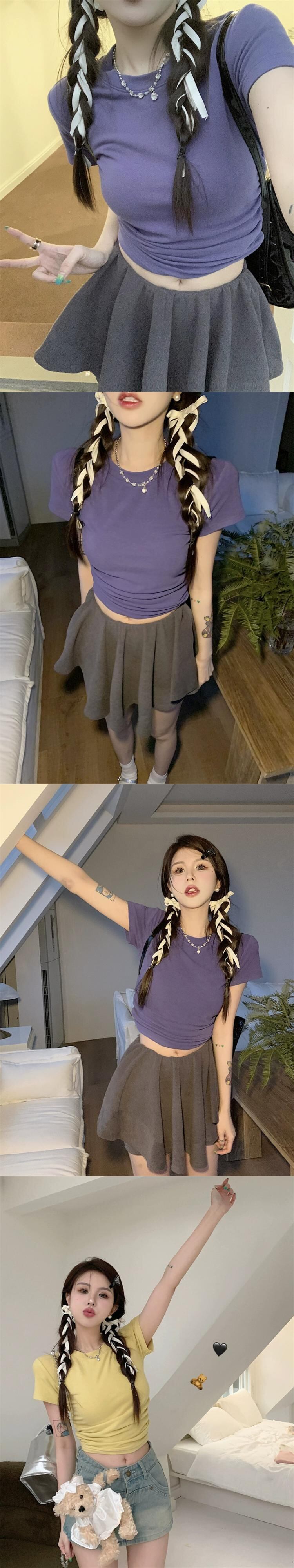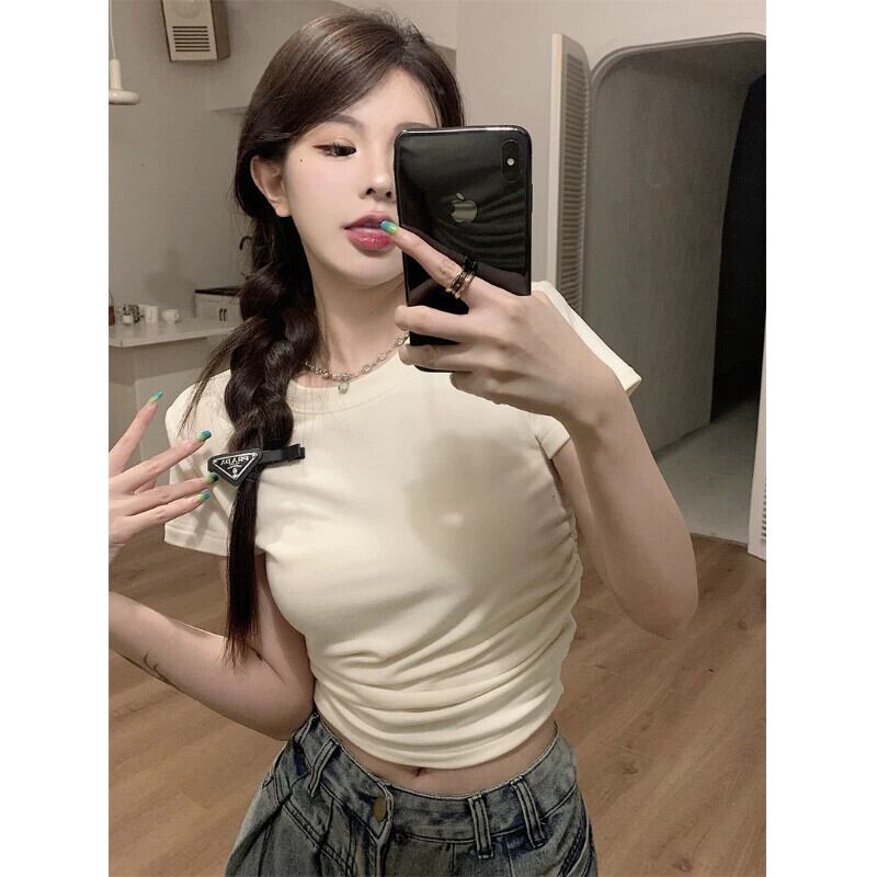 基本的な無地多用途ラウンドネック半袖 Tシャツ女性の夏の 2023 新デザインプリーツウエスト痩身トップ サマー 夏物 Oネック ソリッドカラー 0921915792185596