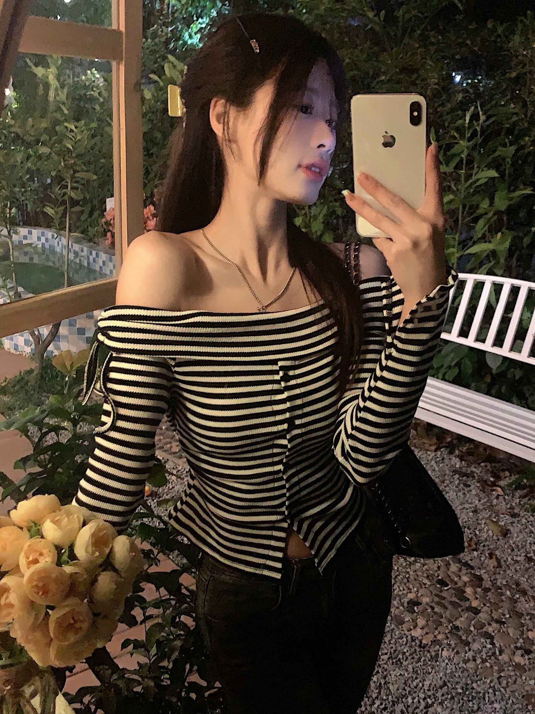 ホットストラップワンショルダー長袖ストライプ Tシャツ女性初秋 2023 新しいセクシーなスリムスリットオフショルダートップ ロング オータム 秋物 0921921183746878