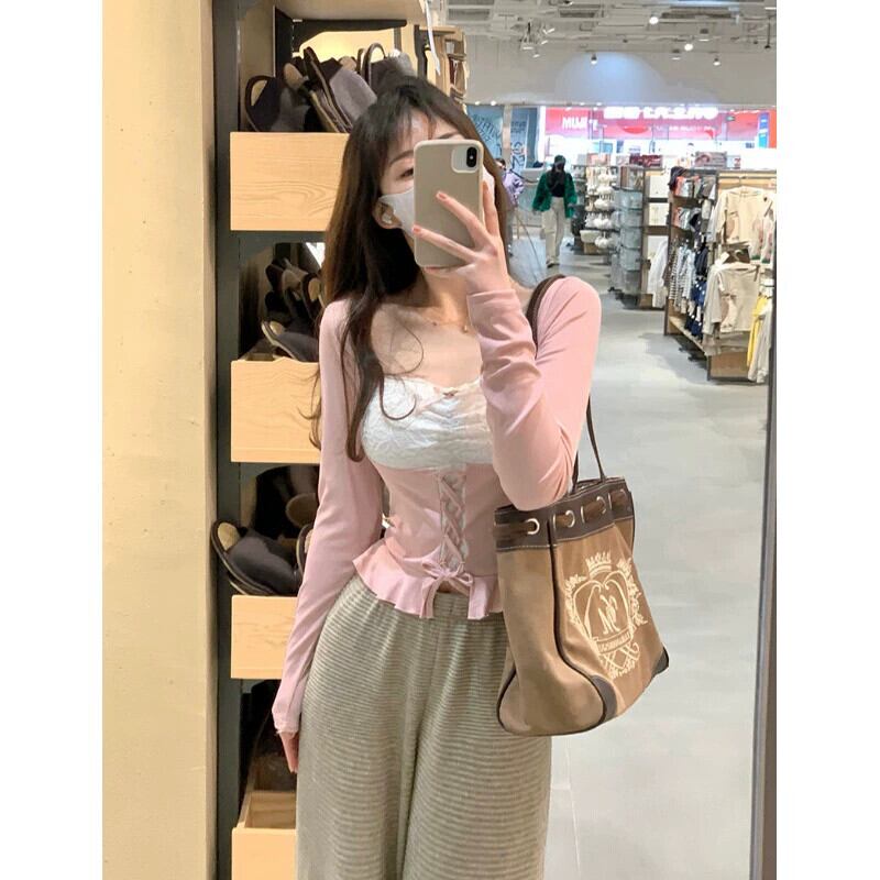 エドスクエアカラーレーススプライシング長袖 Tシャツ女性秋 2023 新しいレースアップショートスリムフィットトップ ロング オータム 秋物 スクウェア 0921979005022886