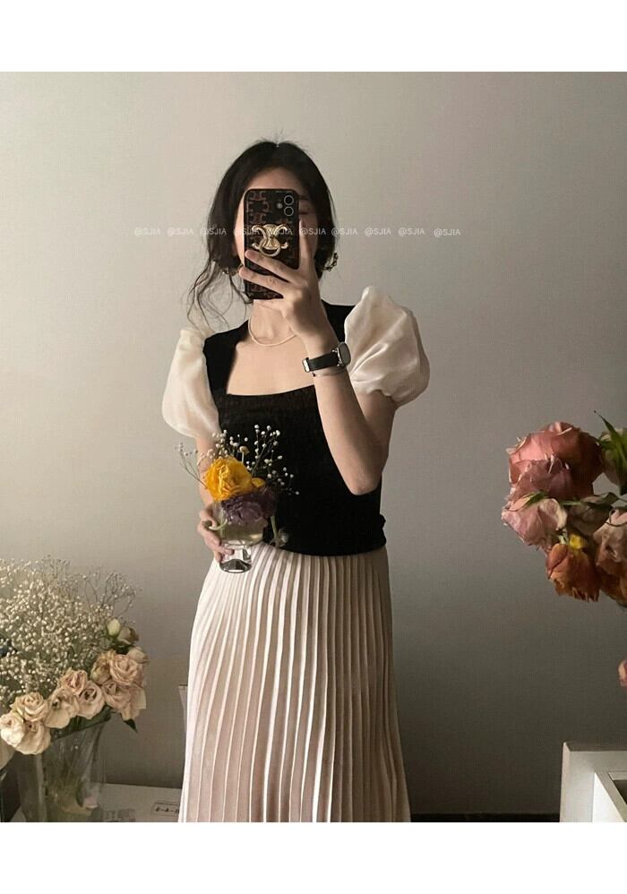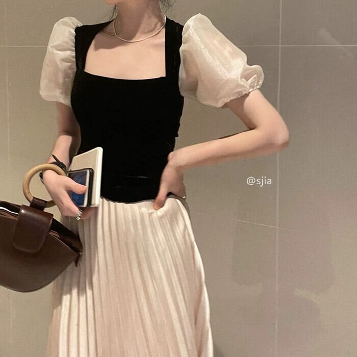 フレンチスクエアネックベルベットスプライシング半袖 Tシャツ女性の夏 2023 新しいスタイル純粋な欲望スタイルショートスリムフィットトップ サマー 夏物 ピュア スクウェア 0921974993735841