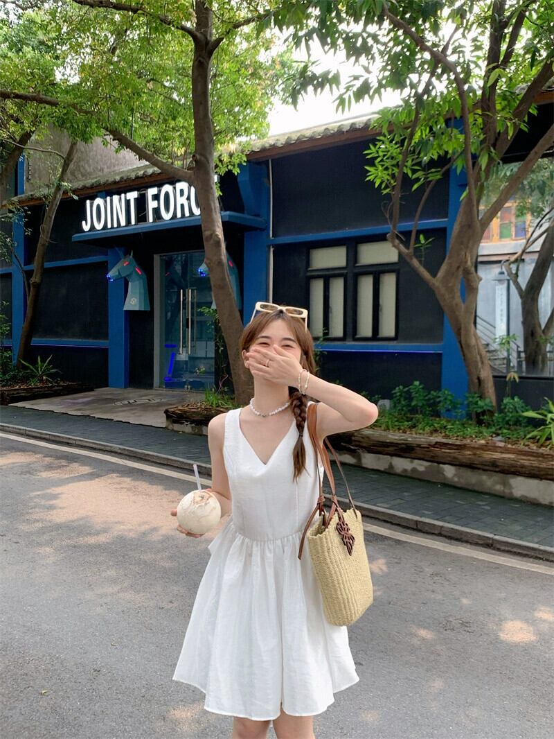 年齢を減らす白い V ネックベストドレス女性の夏 2023 新しい蝶結びスリミングショートスカートトレンディな ホワイト リボン サマー 夏物 Vネック 0921996995592961