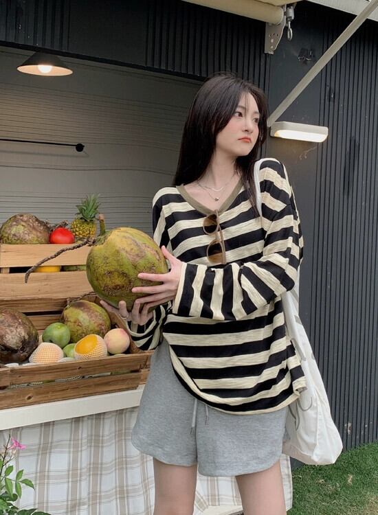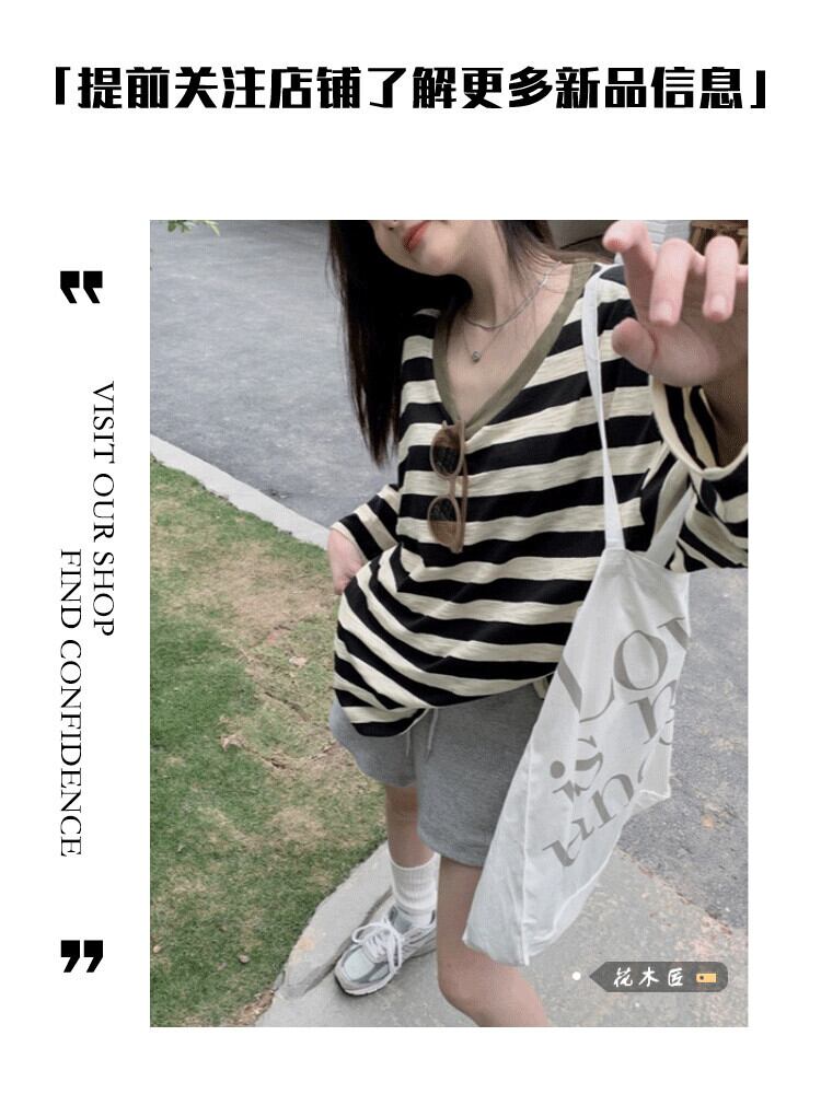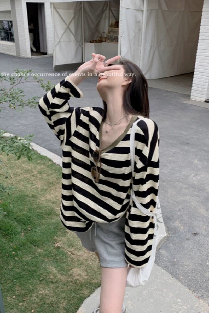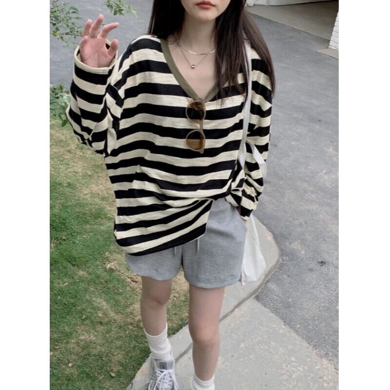 怠惰なスタイルのコントラストストライプ V ネック長袖 T シャツの女性の 2023 秋の新しい緩い痩身多目的プルオーバートップ ロング オータム 秋物 Vネック Tシャツ 0921966001749474