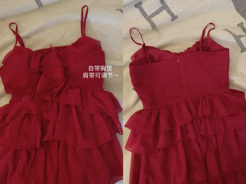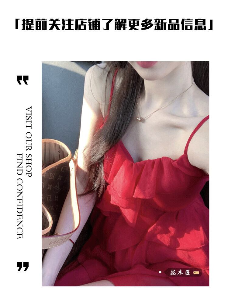 セクシーなスタイルの赤いサスペンダードレスの女性の夏 2023 新しいスタイルのフリルデザインウエスト A ラインスカート レッド サマー 夏物 Aライン 0921978890160161