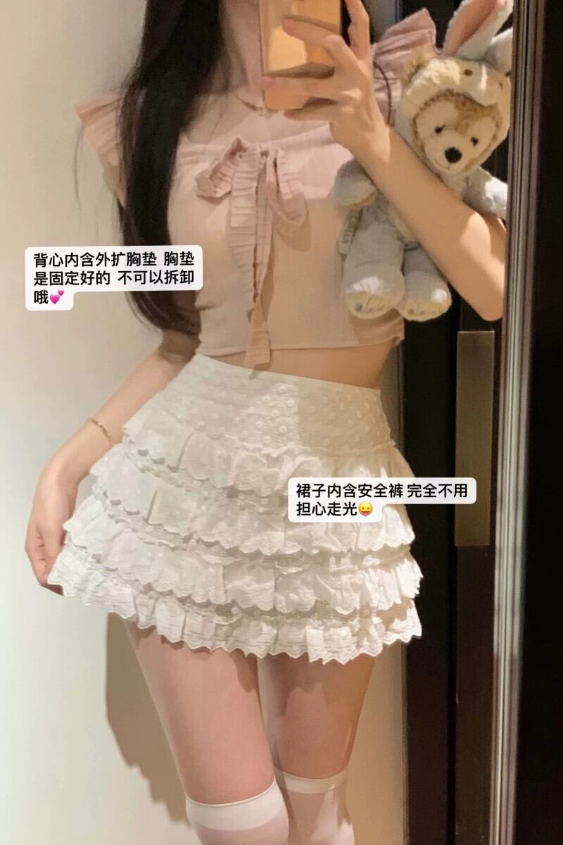 小さなフライングスリーブ付き甘いスーツホルタートップ女性秋ハイウエストケーキスカートレーススカートファッショナブルなツーピースセット ハイウェスト 大人ガーリー スウィート キュート カジュアル オータム 秋物 092195651799720