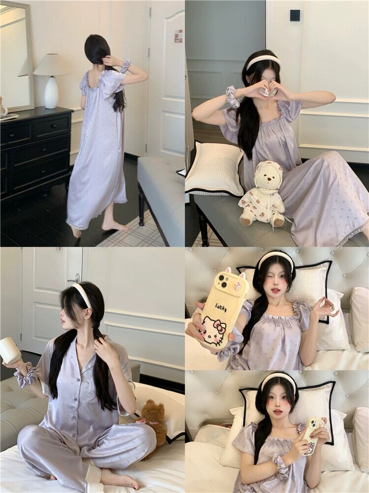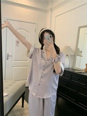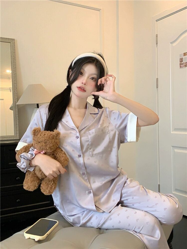 紫色の万能アイスシルクパジャマセット女性 2023 夏の新しい薄手の半袖トップス、パジャマ、ホーム服 2 点セット サマー 夏物 パープル 0921935341696868