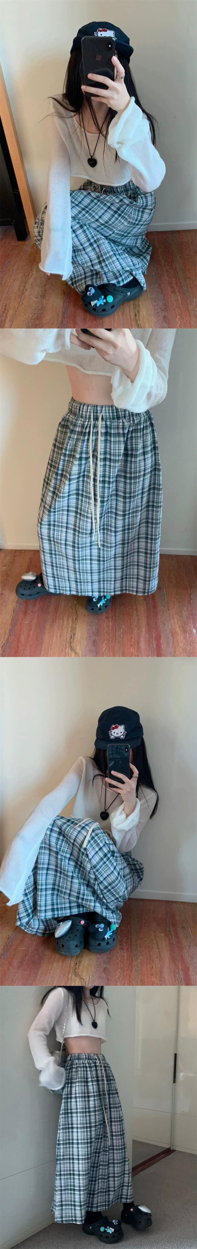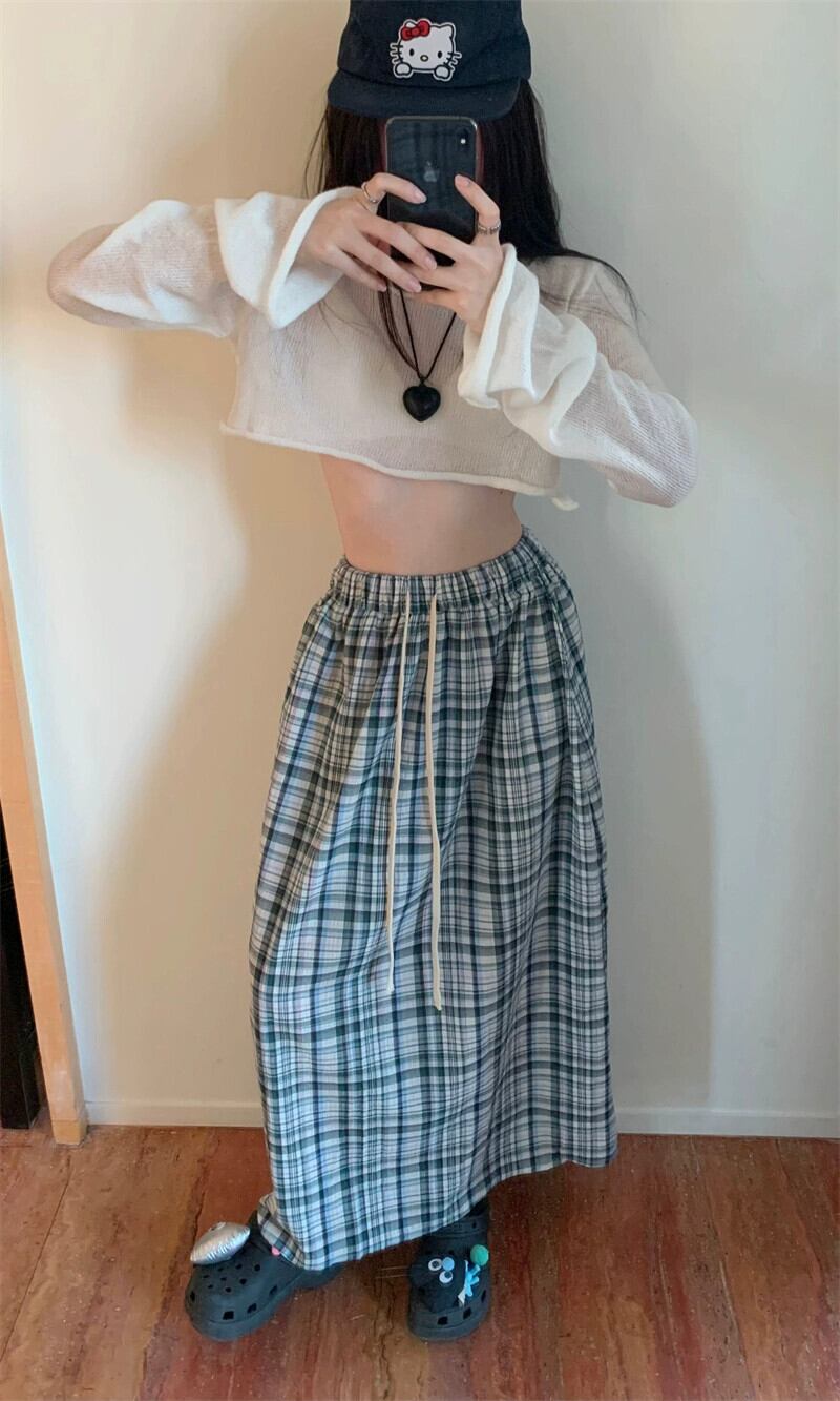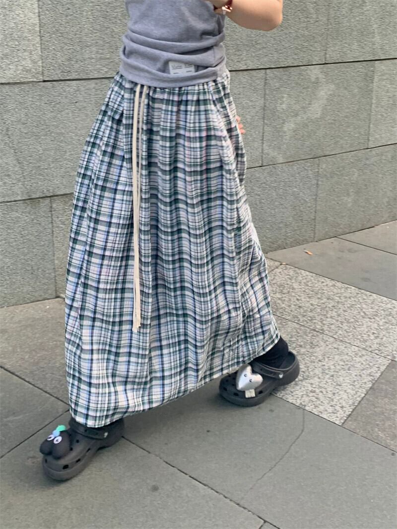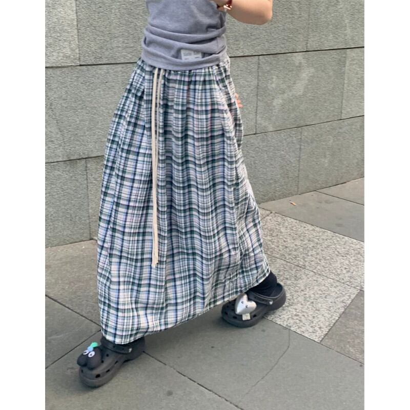 スタイルインコントラストチェック柄スカート女性秋 2023 新デザイン巾着ハイウエスト痩身ロングスカート ハイウェスト オータム 秋物 0921974407748211