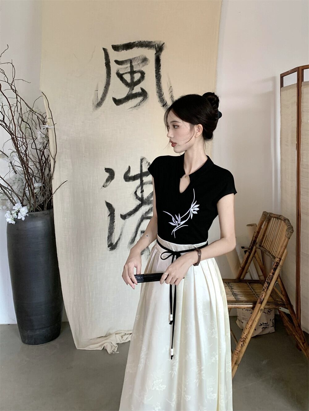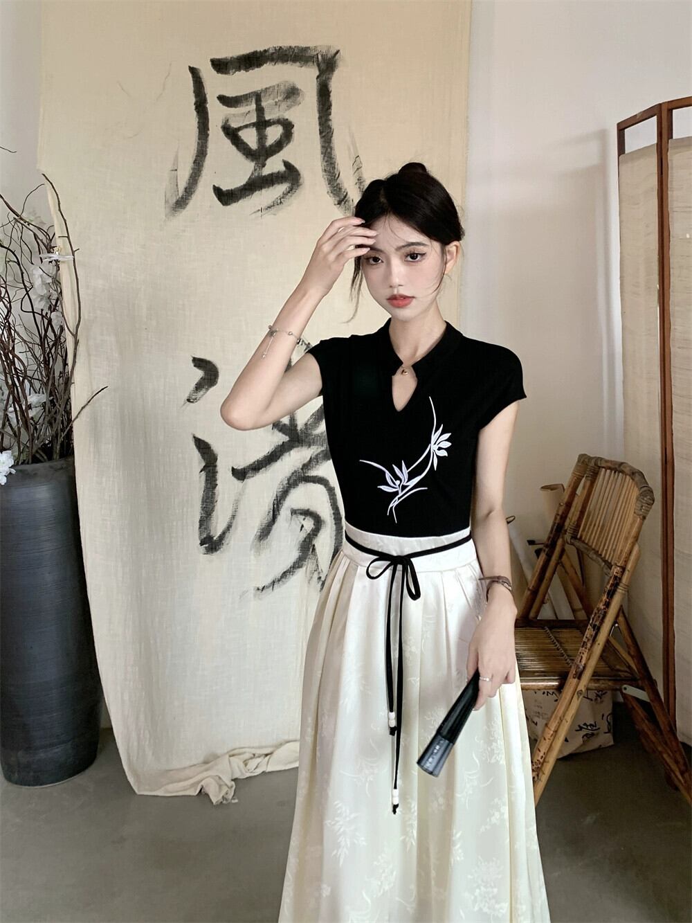中国風の国民風のスーツスカート女性の夏の 2023 新しい V ネック刺繍半袖 Tシャツ馬の顔スカート 2 点セット レッド サマー 夏物 Vネック 0921984922419053
