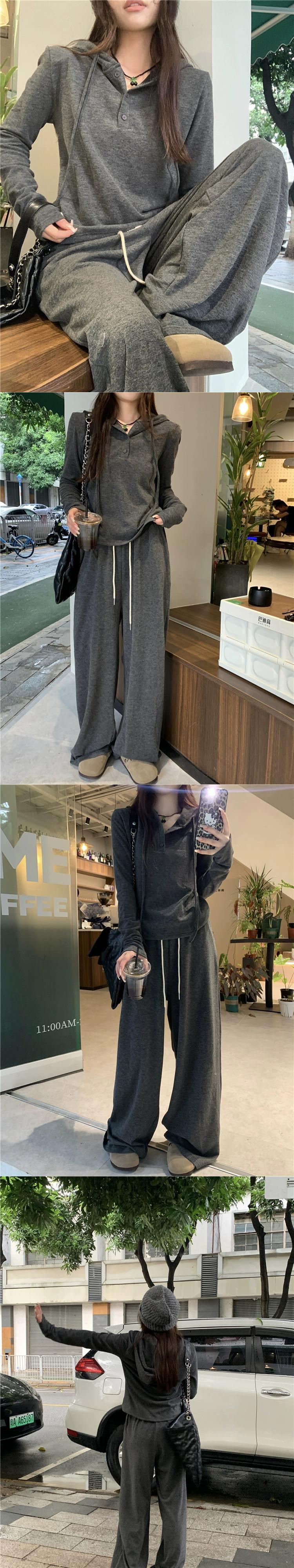 スタイルカジュアルスーツ女性の長袖プルオーバーフード付きコートトップ秋ハイウエストワイドレッグパンツグレーツーピースセット ロング オータム 秋物 0921937239034645