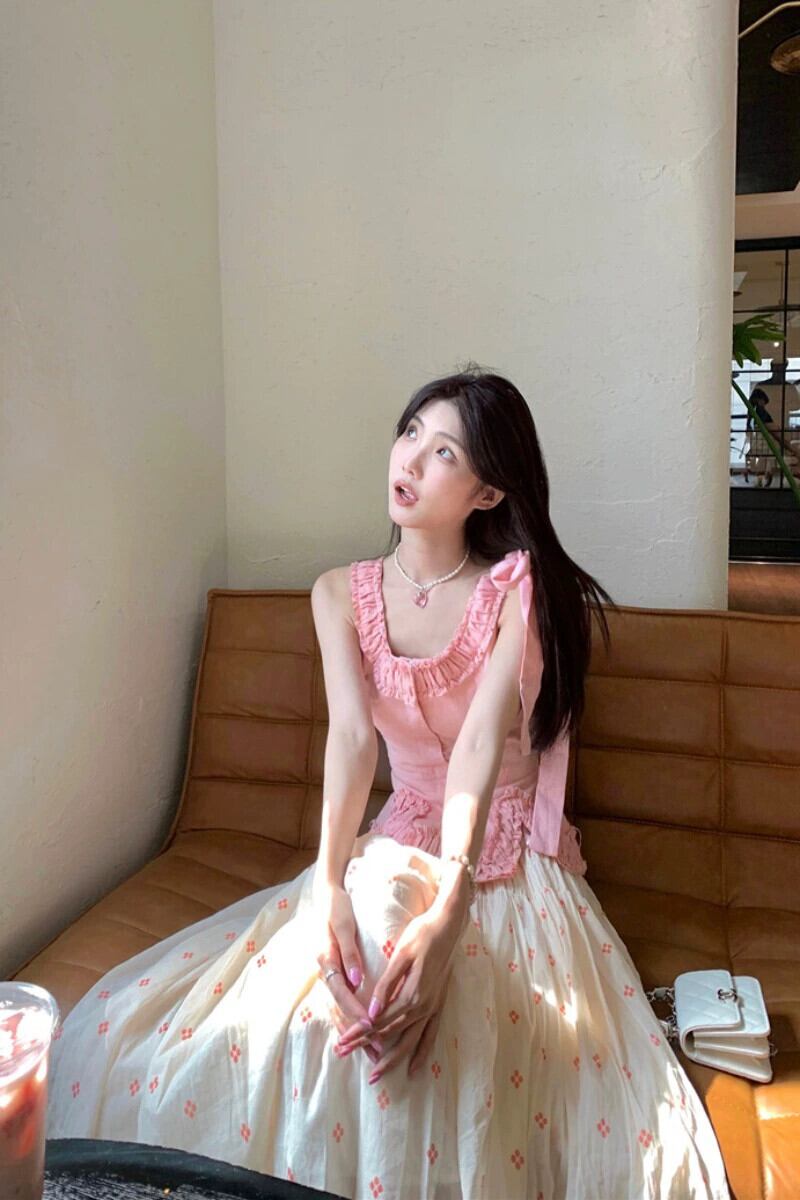 甘くて優しい y スーツ女性 2023 夏の新しいピンクのベストトッププリントスカート 2 点セット 大人ガーリー スウィート キュート カジュアル サマー 夏物 0921993702321548