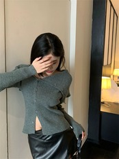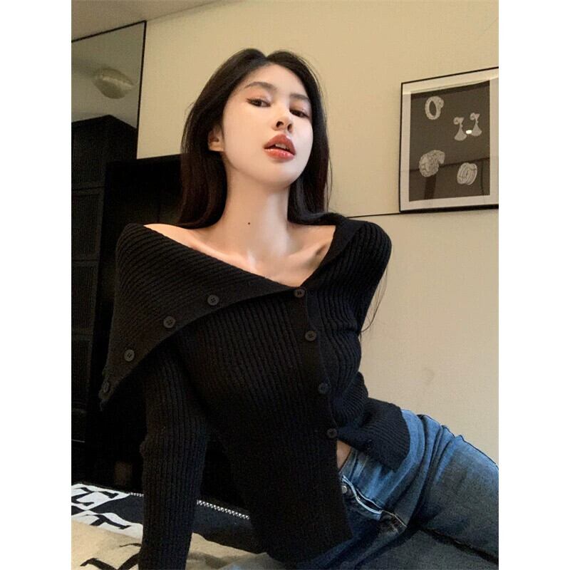 フレンチシックなワンラインカラー長袖セーターの女性の秋 2023 新しいスタイルのオフショルダー気質デザインセータートップ ロング オータム 秋物 0921929911420340