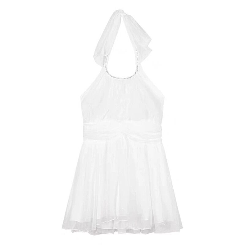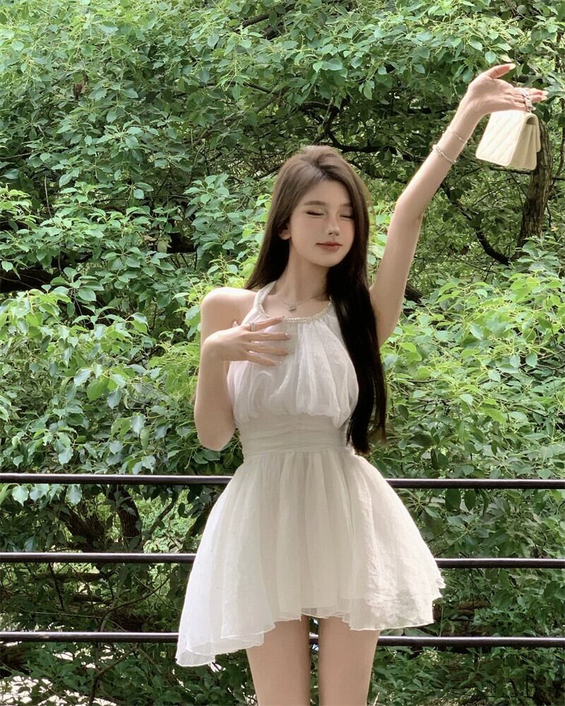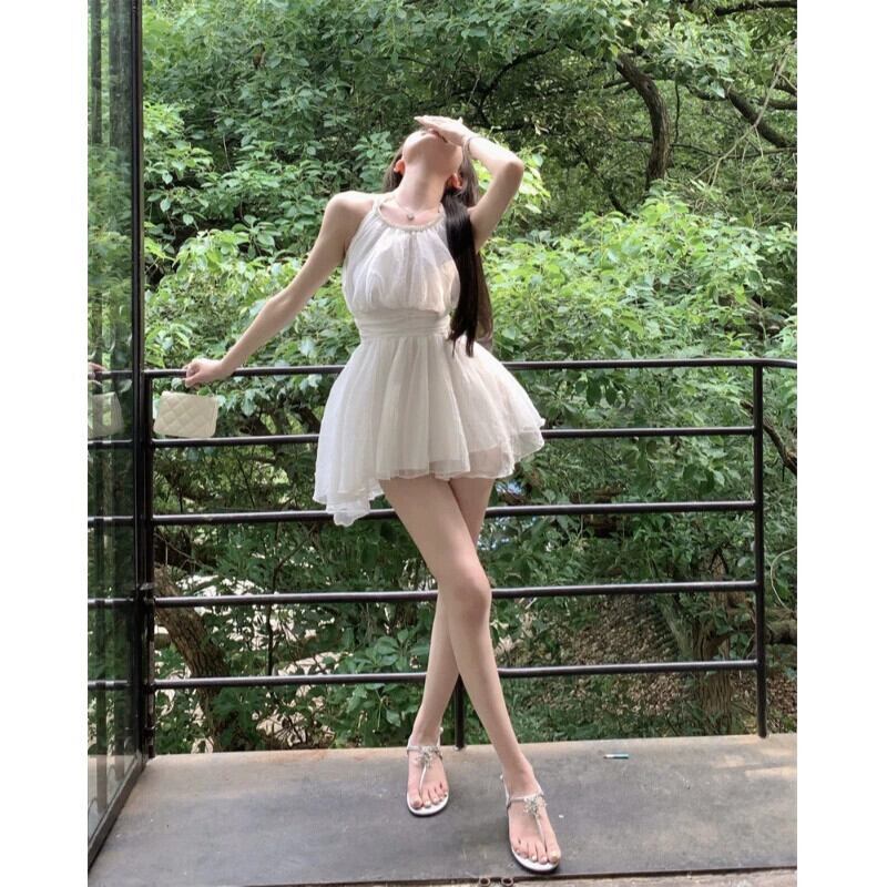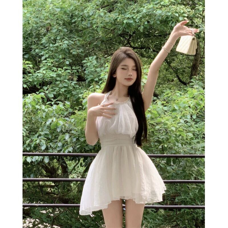 夏の気質的な白いシフォンのホルターネックドレスの女性、ウエストを締める純粋な欲望、セクシーなノースリーブのAラインスカート、妖精のスカート ホワイト サマー 夏物 ピュア 0921998971125526