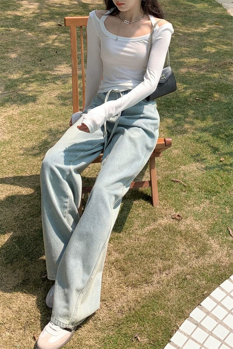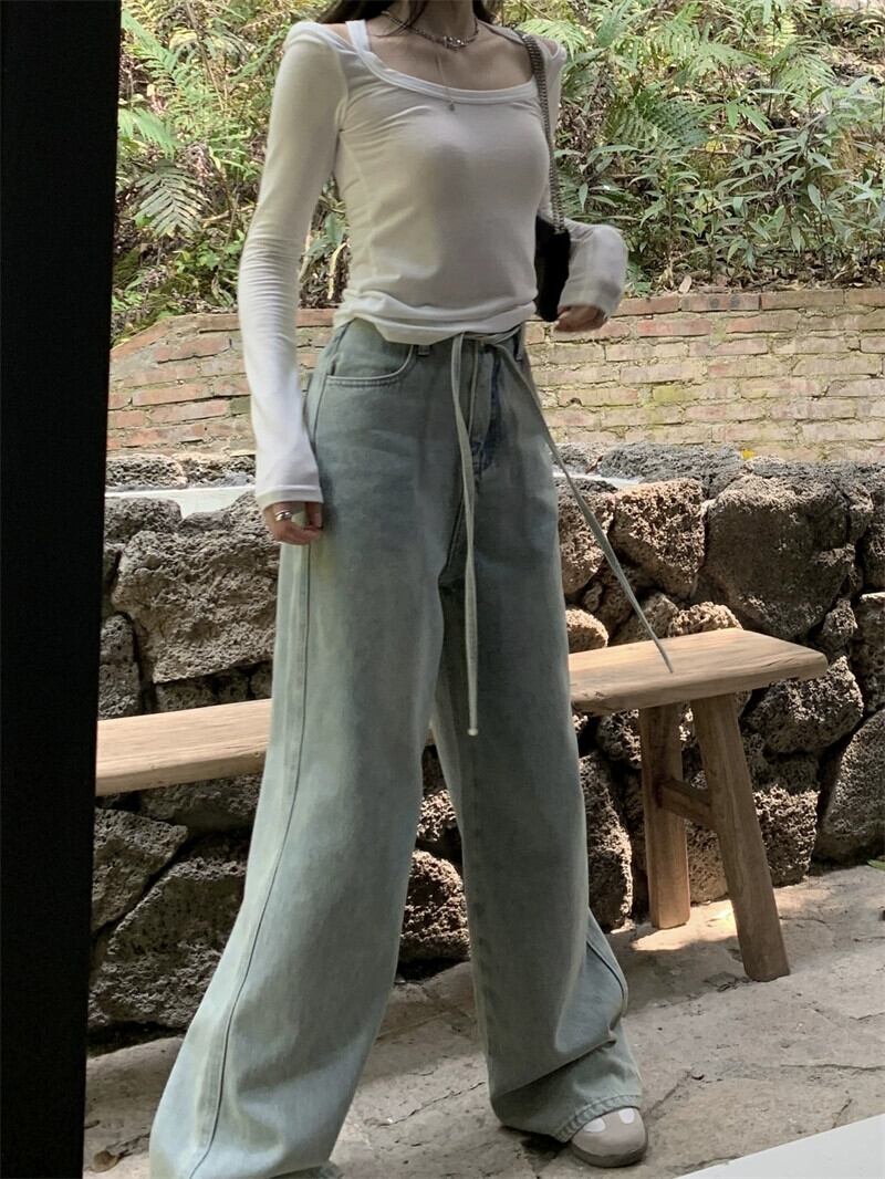 怠惰なスタイル巾着ライトカラージーンズ女性の夏 2023 新しい気質多用途カジュアルハイウエスト痩身ワイドレッグパンツ レッド サマー 夏物 0921967935460214