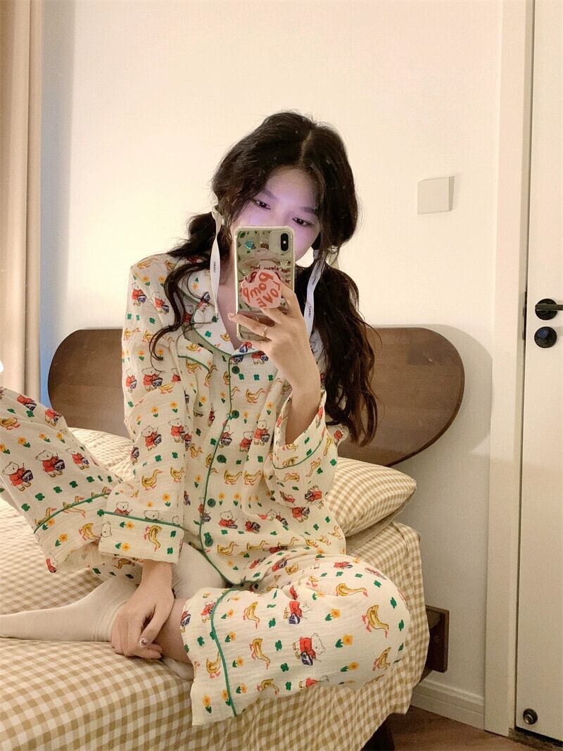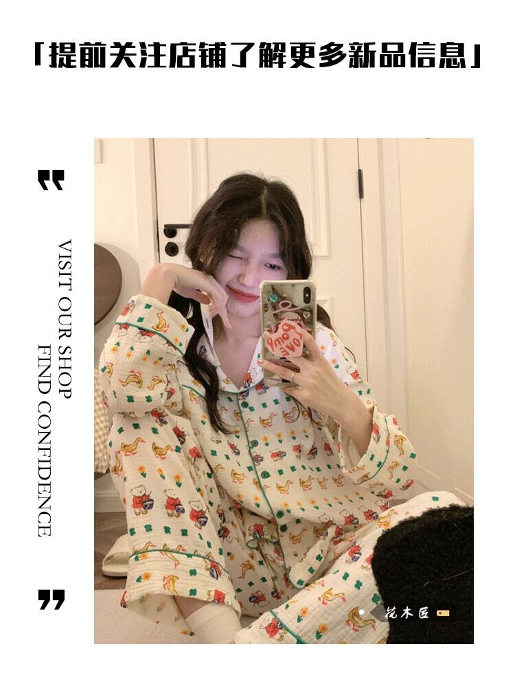 老化漫画クマパジャマセット女性の秋 2023 長袖トップスパジャマパンツホームツーピースセット ロング オータム 秋物 0921992805532700