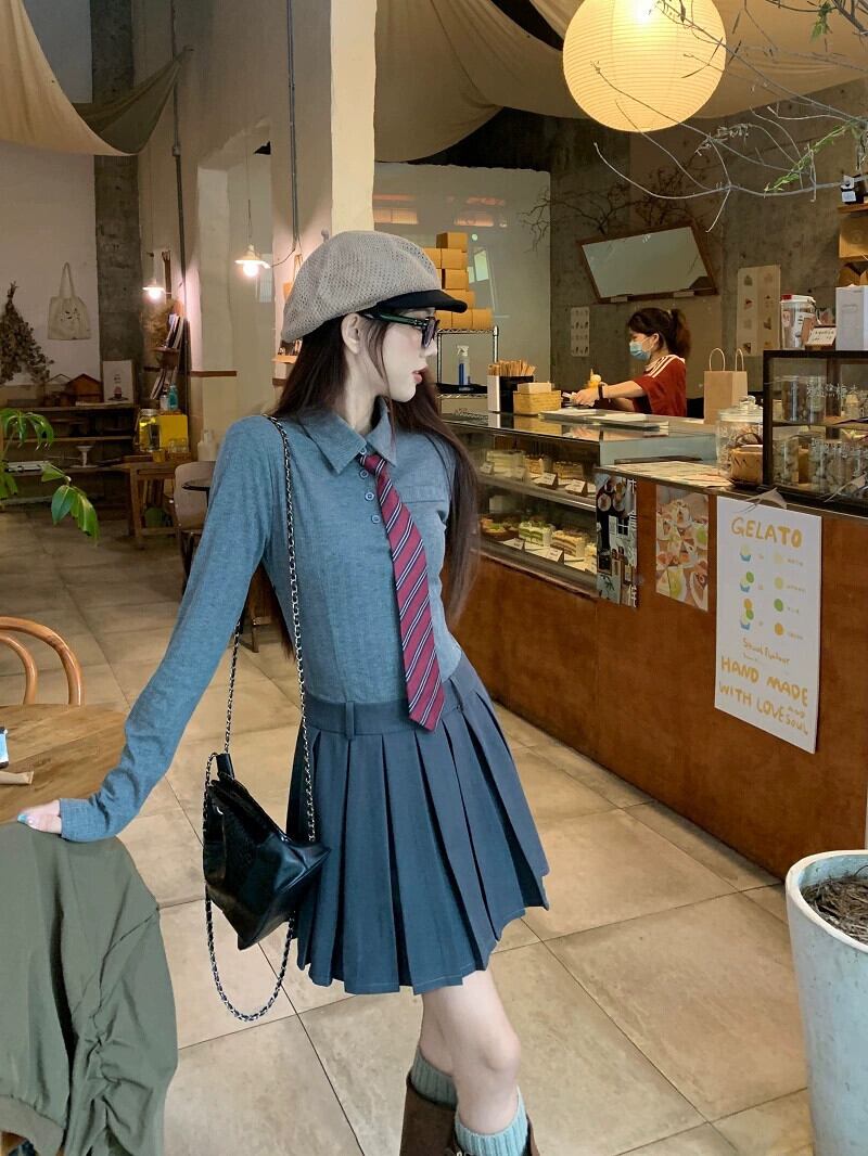 レトロポロカラー長袖ドレスの女性の秋 2023 新しいスタイルウエスト痩身多用途プリーツ A ラインスカート ロング オータム 秋物 Aライン 0921927523727971