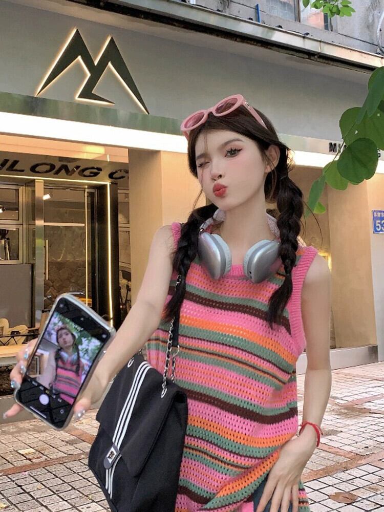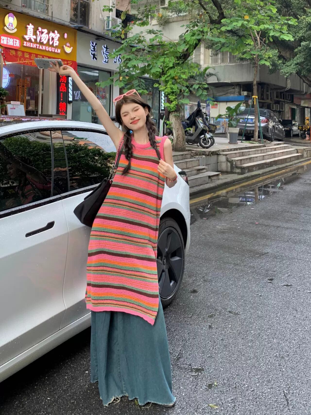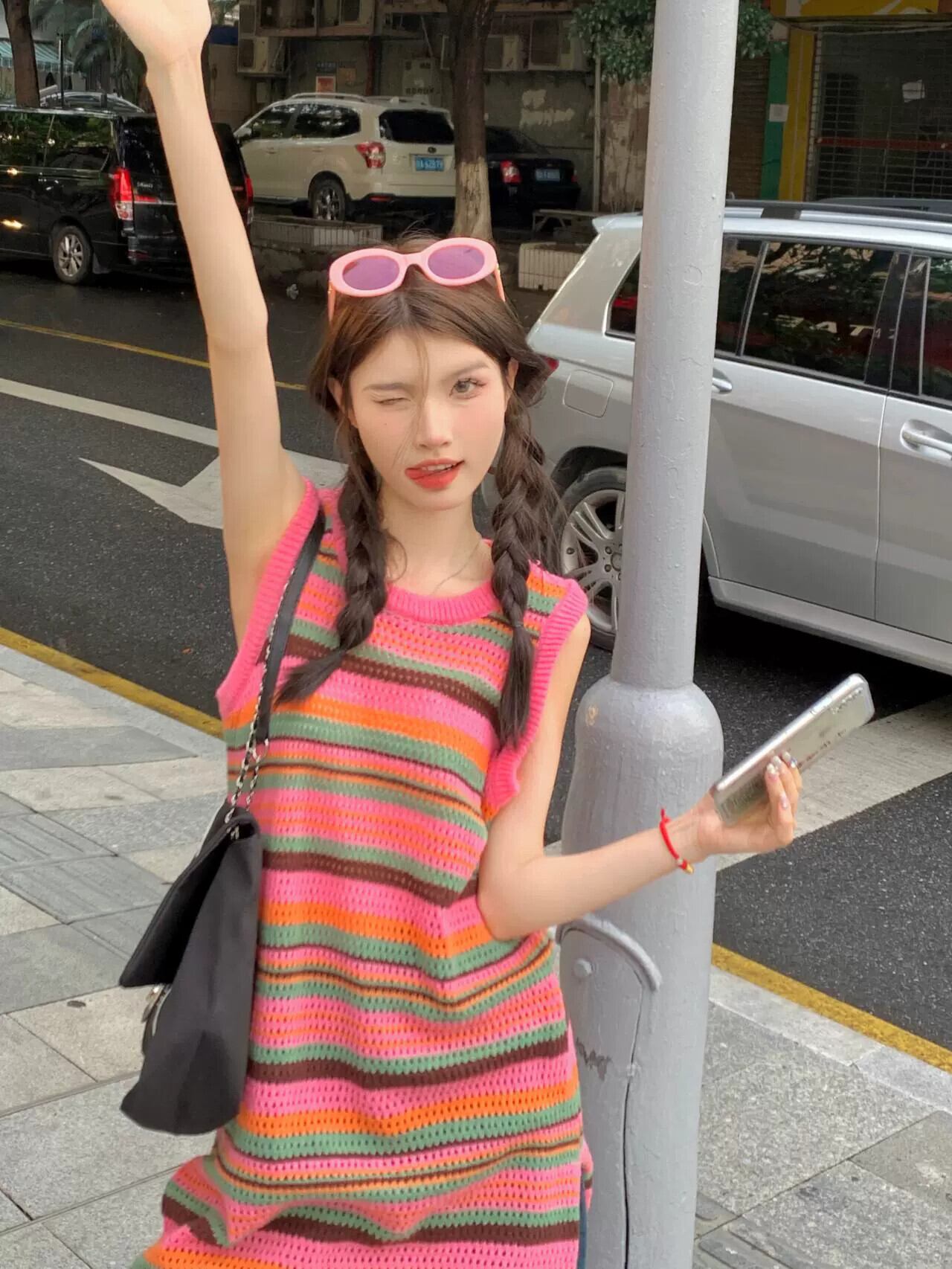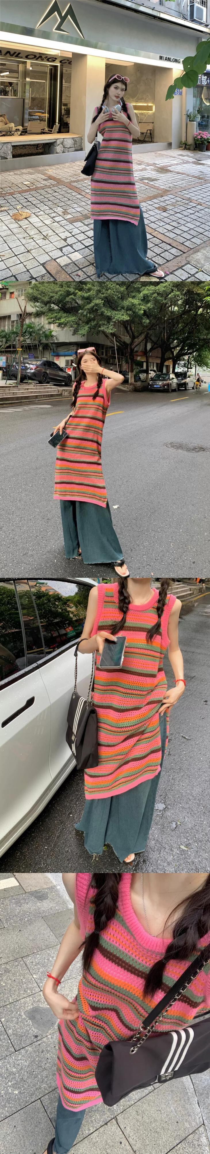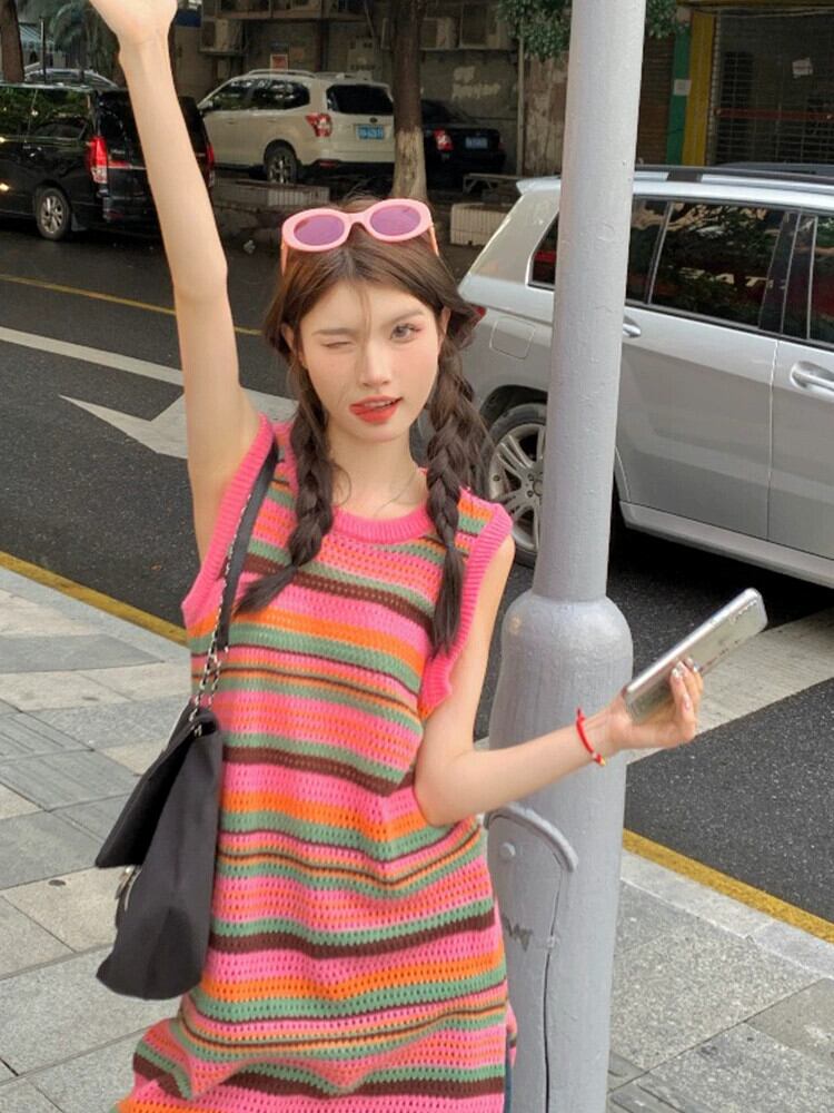 ドーパミンコントラストカラーストライプニットベストドレス女性の夏甘いホットガールルーズノースリーブスリットミッドレングススカート 大人ガーリー スウィート キュート カジュアル サマー 夏物 0921956656033026