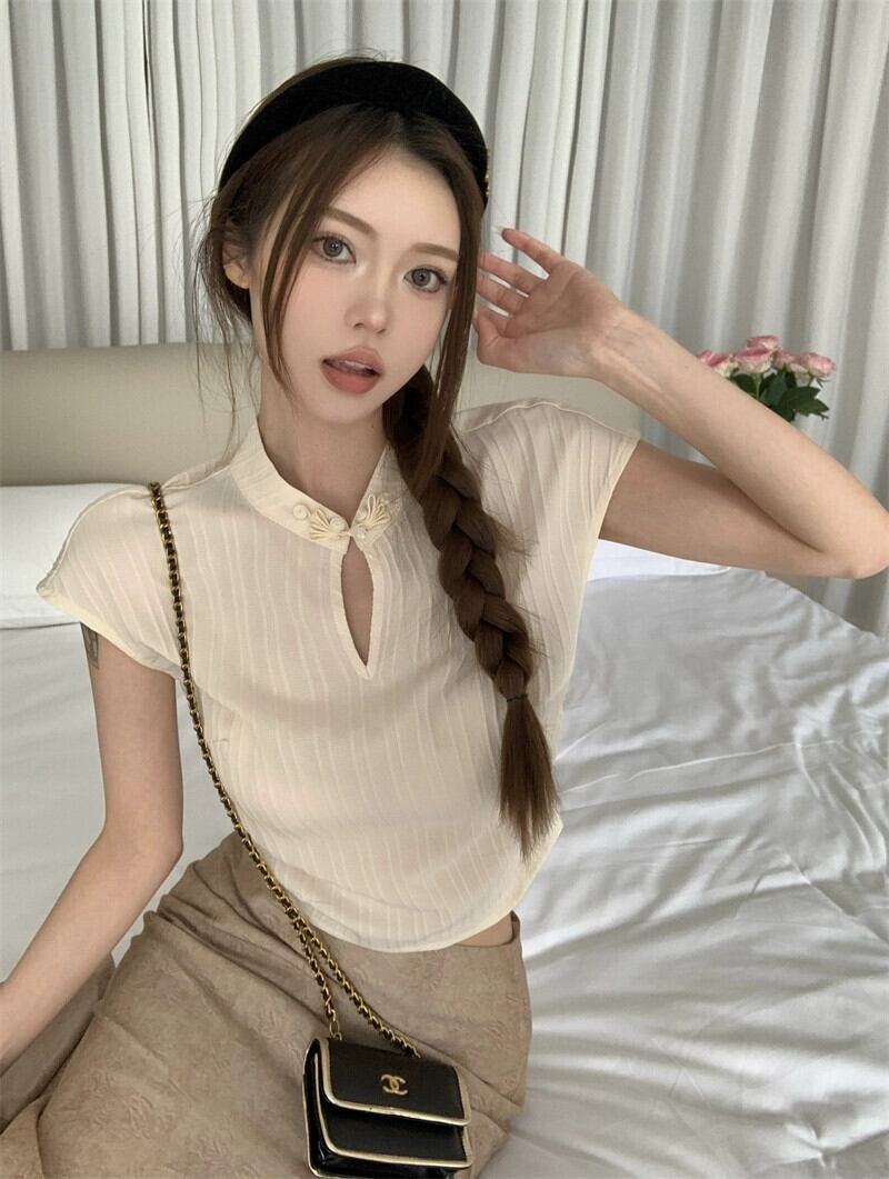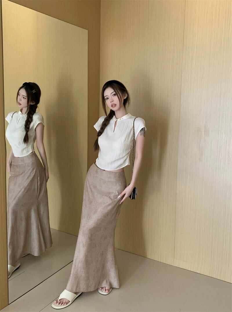 中国風プレートボタンスタンドカラー半袖トップスレディースサマースーツハイウエストスリムミモレ丈スカート2点セット 夏物 092198005789291