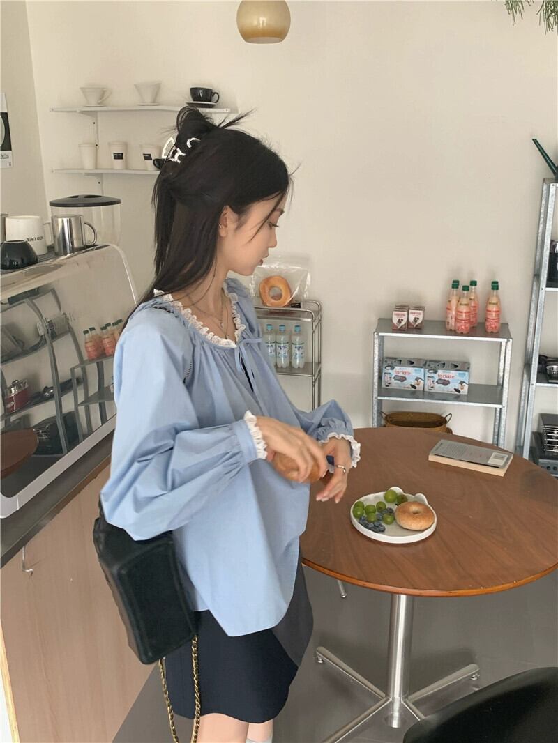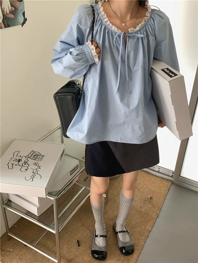 甘いレース長袖シャツレディース 2023 秋の新作シックなレースアップラウンドネックルーズトップ ロング 大人ガーリー スウィート キュート カジュアル オータム 秋物 Oネック 0921982593416099