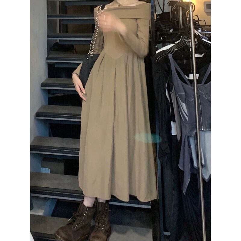 フレンチスタイルのワンライン襟長袖ドレスの女性の秋 2023 新しいハイエンドウエスト痩身ミッドレングススカート ロング オータム 秋物 0921924649402568