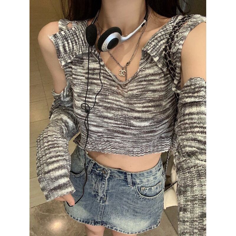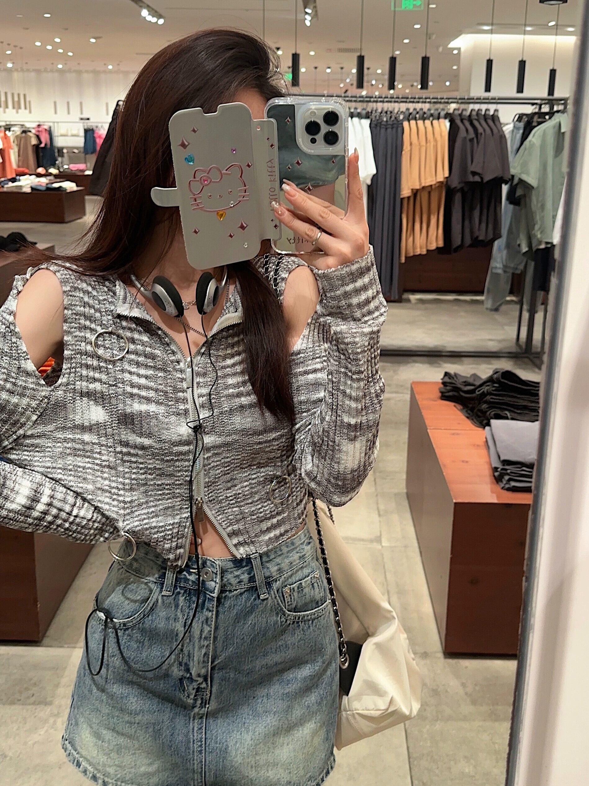 中空デザインオフショルダー長袖セーター女性秋 2023 新しいニッチレトロダブルジッパーカーディガントップ ロング オータム 秋物 0921949308132286
