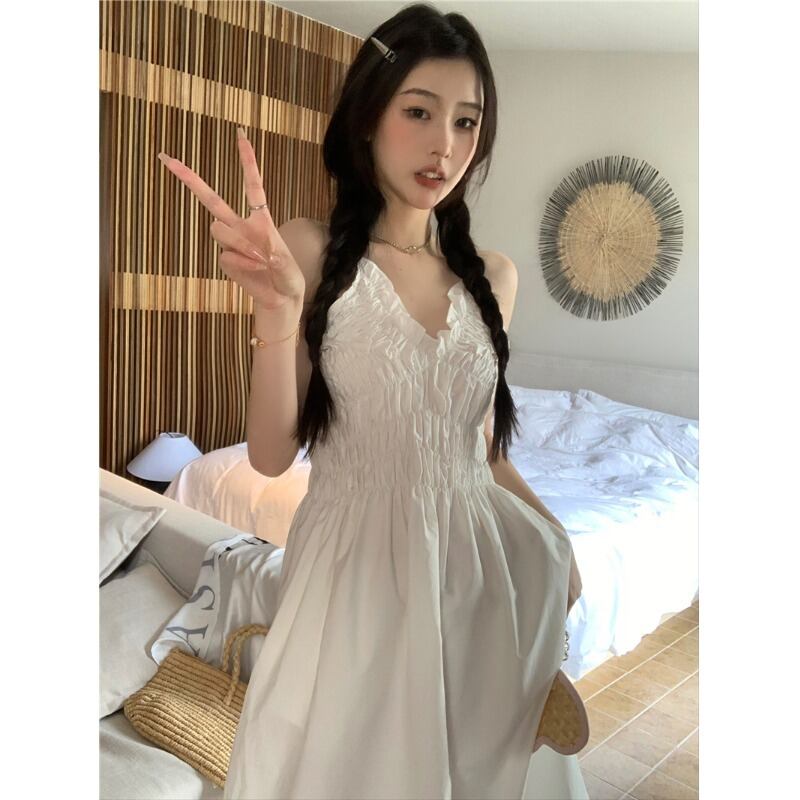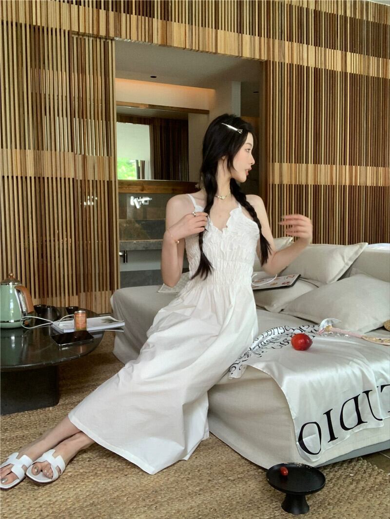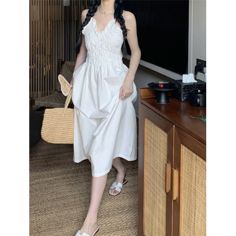 優しいスタイルの白プリーツ V ネックサスペンダードレス女性の夏 2023 新しいスタイルの気質ウエスト痩身ミッドレングススカート ホワイト サマー 夏物 Vネック 0921986392193116