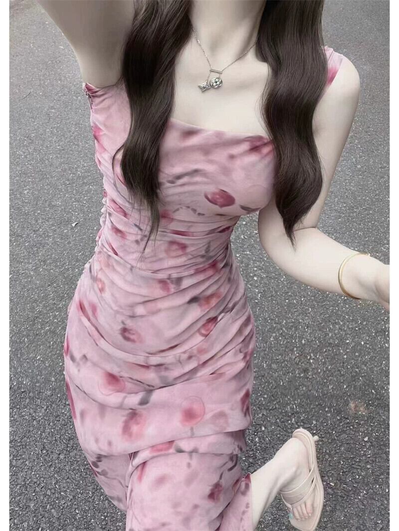 フランスの純粋な欲望ピンクの花柄ドレス女性の夏の 2023 新しいスリムウエストとスリムヒップカバーサスペンダーロングスカート サマー 夏物 ピュア 0921994166976588