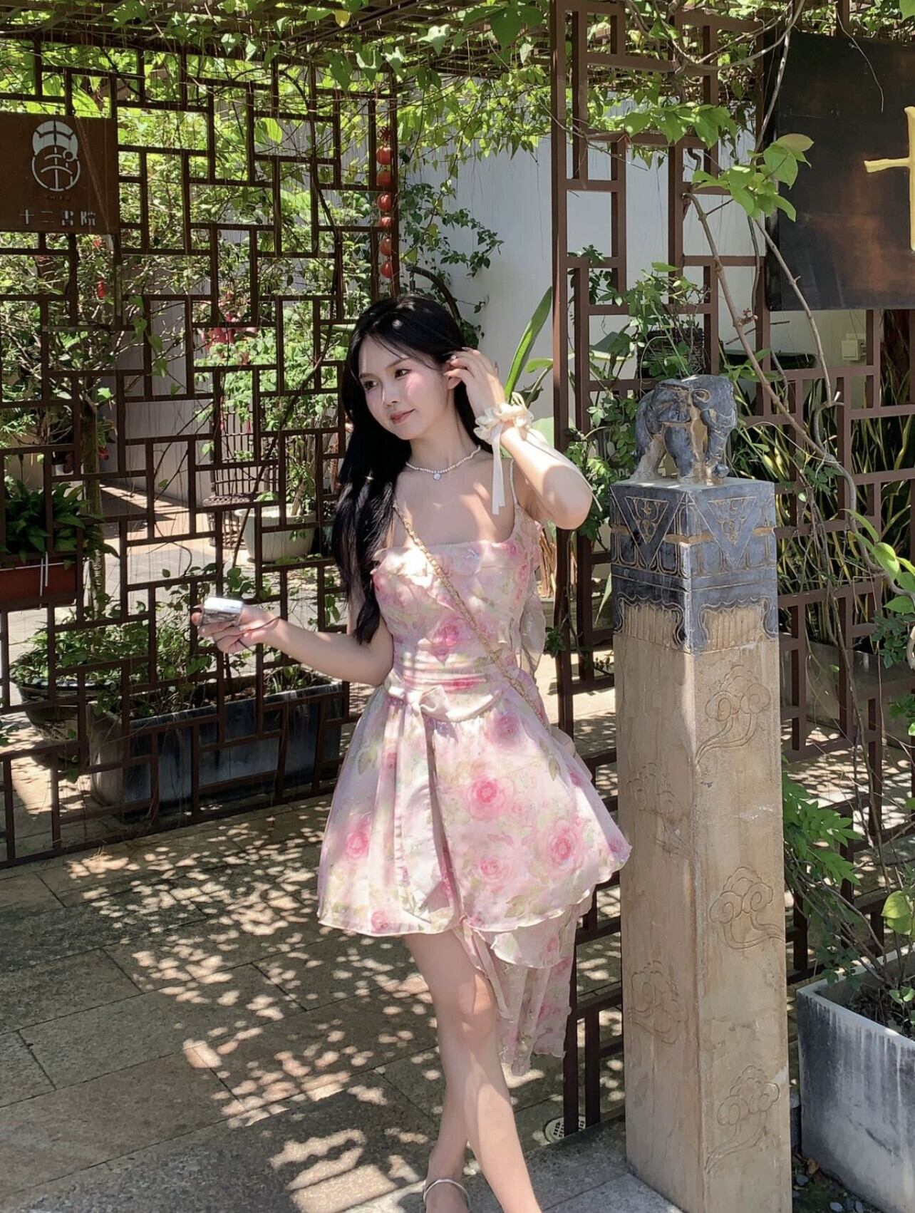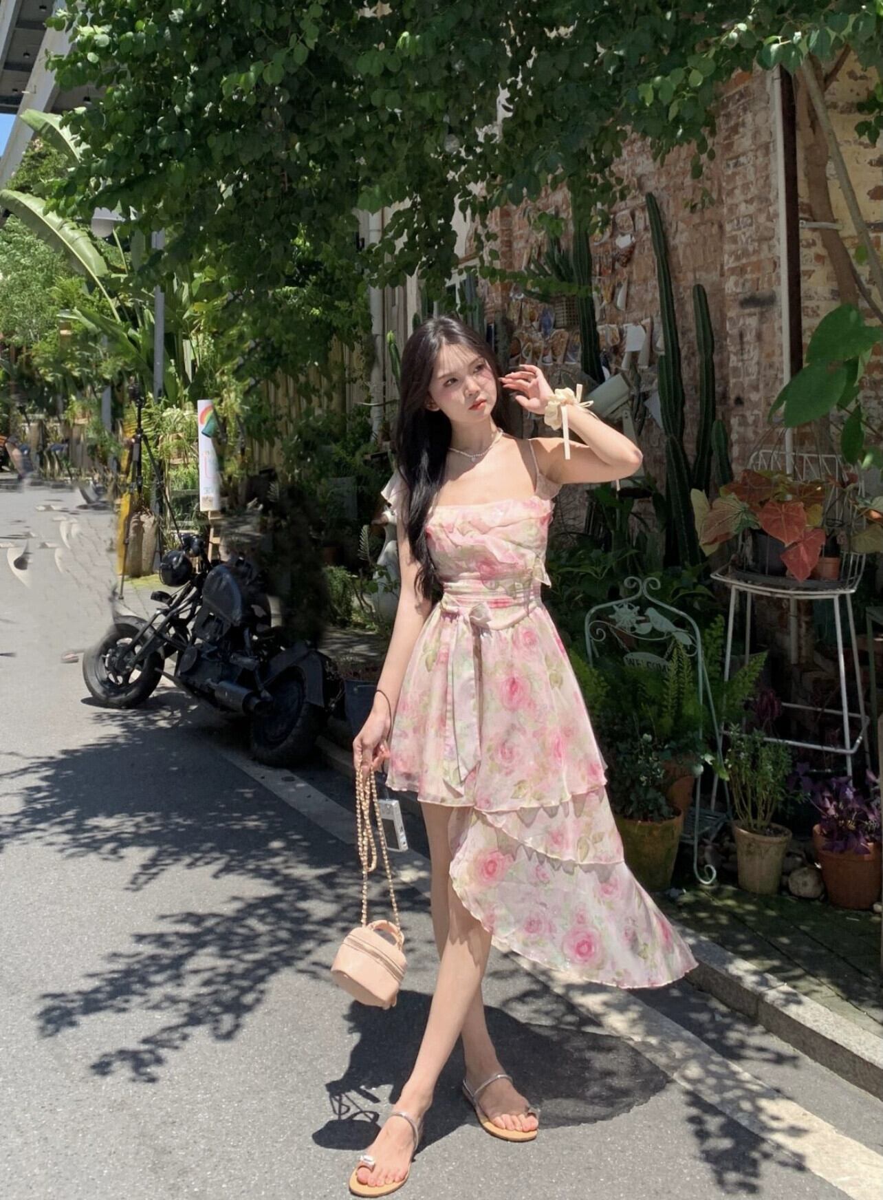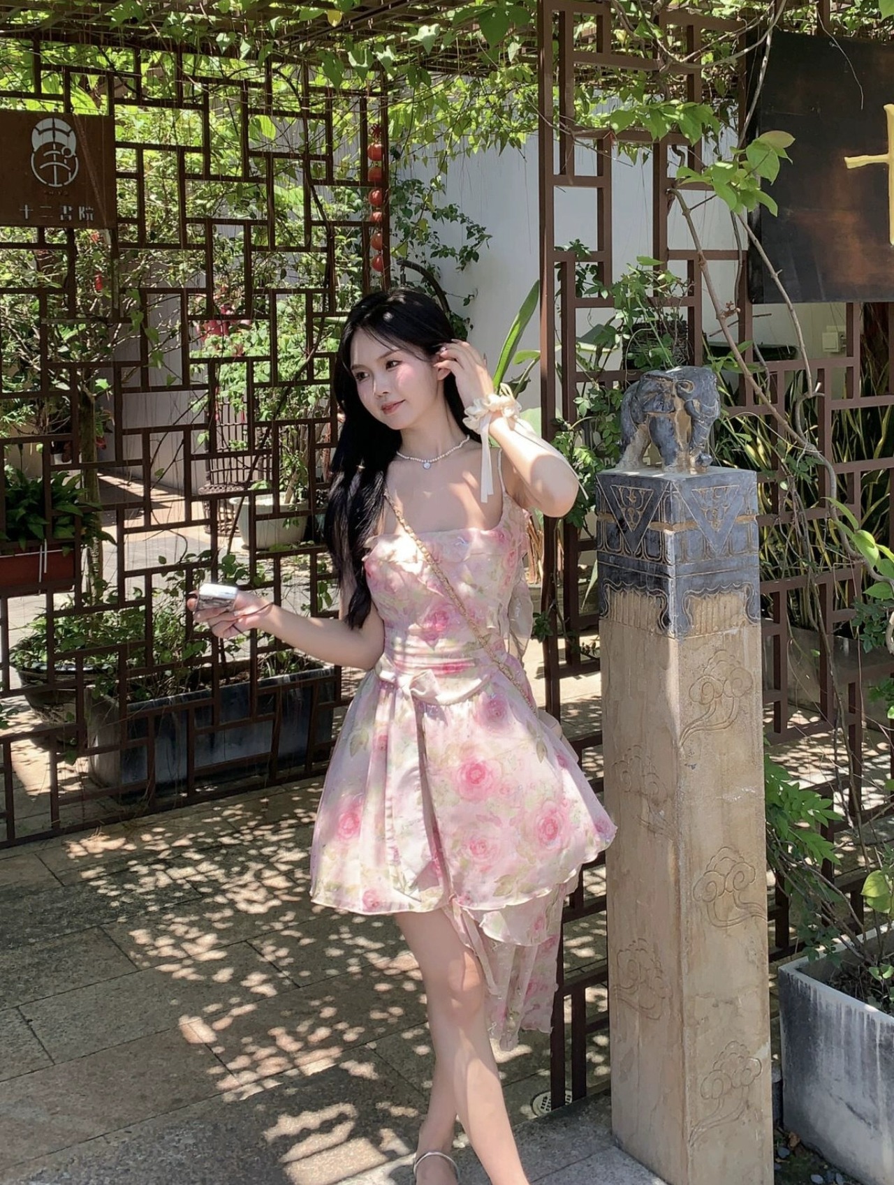甘い花柄サスペンダードレス女性の夏のシフォンミドル丈スカートハイエンドの気質ウエストイレギュラースカート 大人ガーリー スウィート キュート カジュアル サマー 夏物 0921949584666057