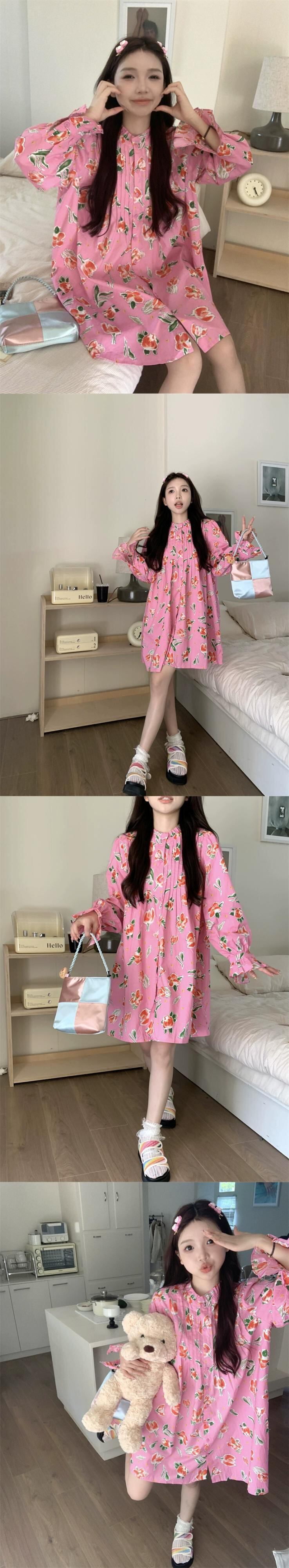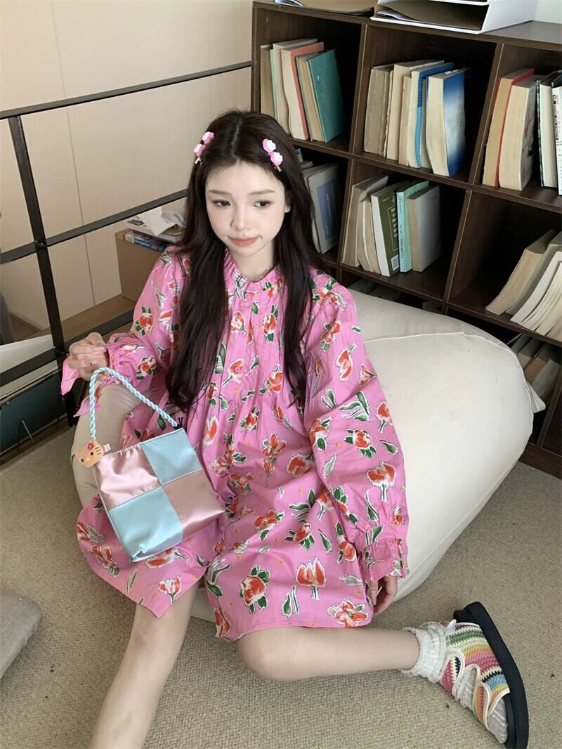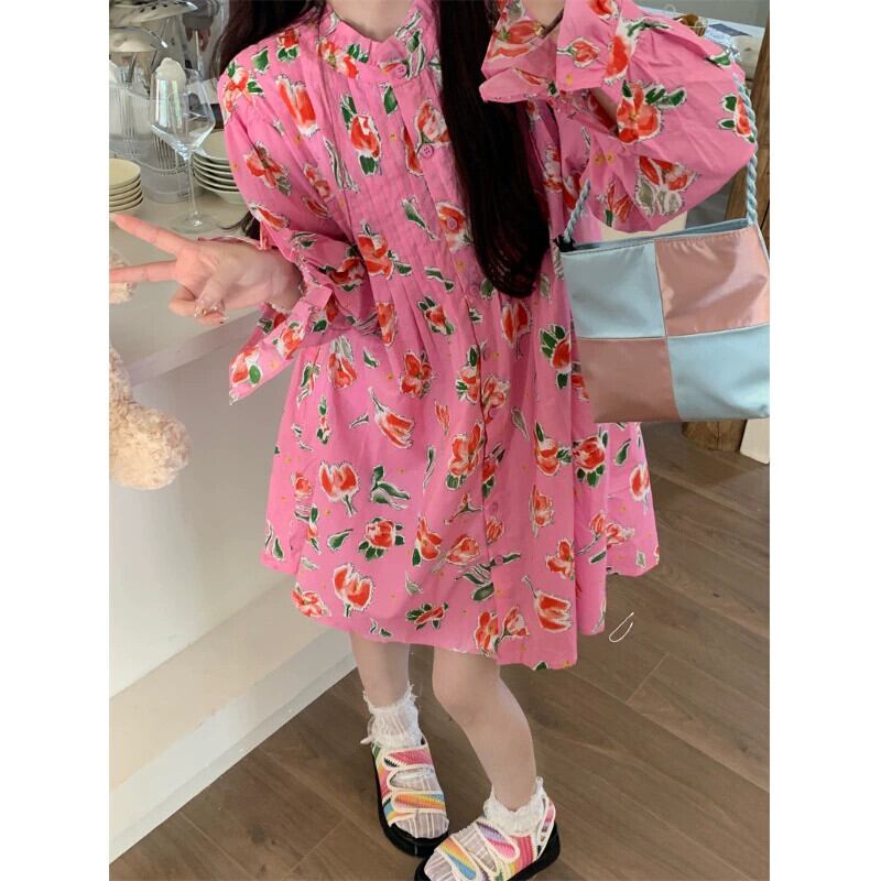 甘い年齢を減らすピンクの花柄ドレスの女性の夏の 2023 新しいスタイルのルーズでスリムな長袖 A ラインスカート ロング 大人ガーリー スウィート キュート カジュアル サマー 夏物 Aライン 092197302844952