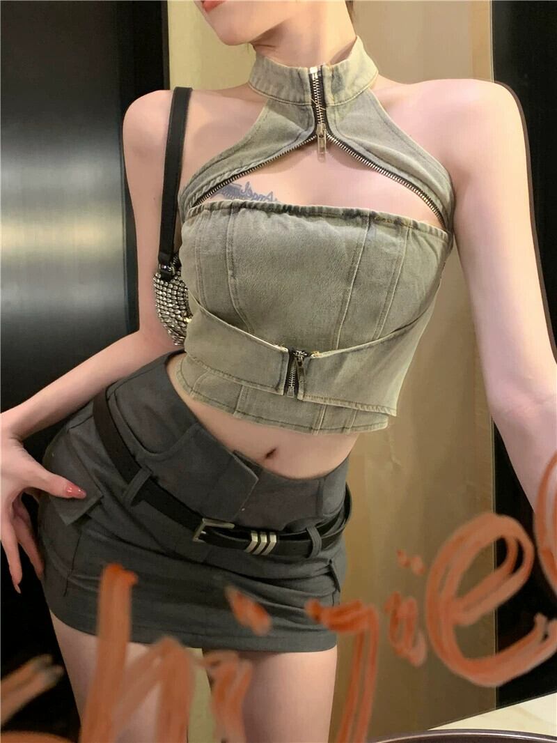 アメリカンデニムチューブトップ女性の夏の2023新しいデザイン中空ジッパーホルターネックショートトップ サマー 夏物 0921910663452207
