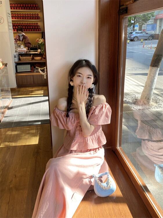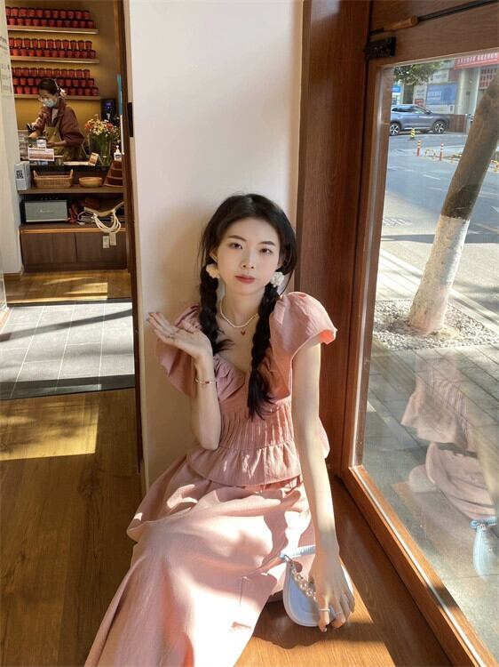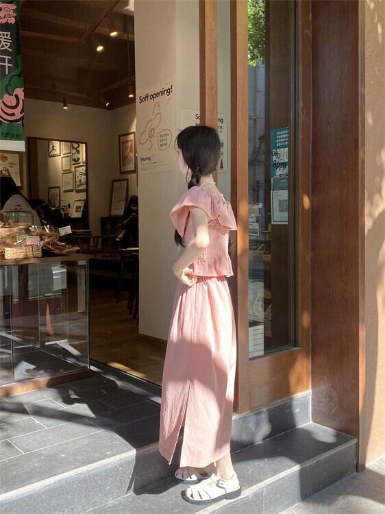 スタイル年齢削減スーツスカート女性の夏 2023 新しいスタイル小さな飛行袖 v ネックトップスリットスカートツーピースセットイン サマー 夏物 Vネック 0921953676869186