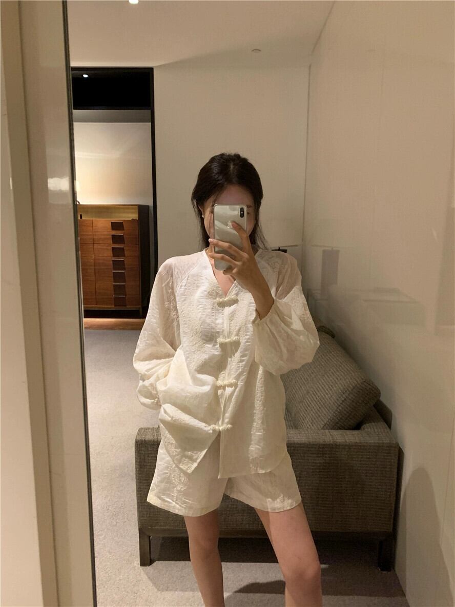 中国風の国民風のスーツの女性の夏の 2023 新しい長袖シャツトップハイウエスト痩身ワイドレッグパンツ 2 点セット ハイウェスト ロング サマー 夏物 ワイドパンツ 0921970715993820