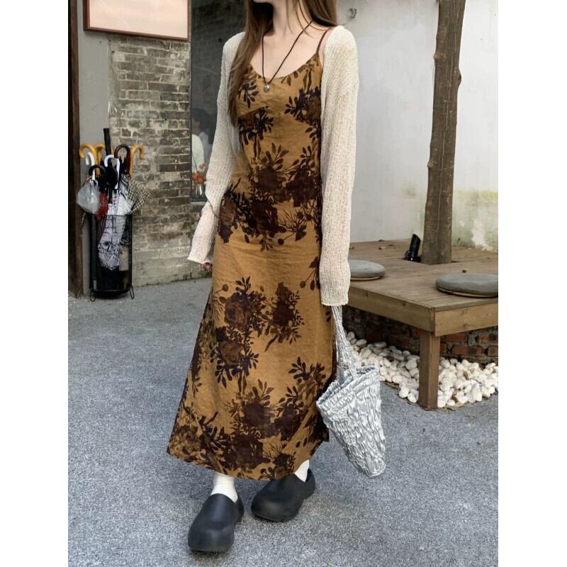 レトロな新中国風プリントサスペンダードレス女性の秋 2023 新しい気質痩身スリムスリットスカート オータム 秋物 0921975517366637