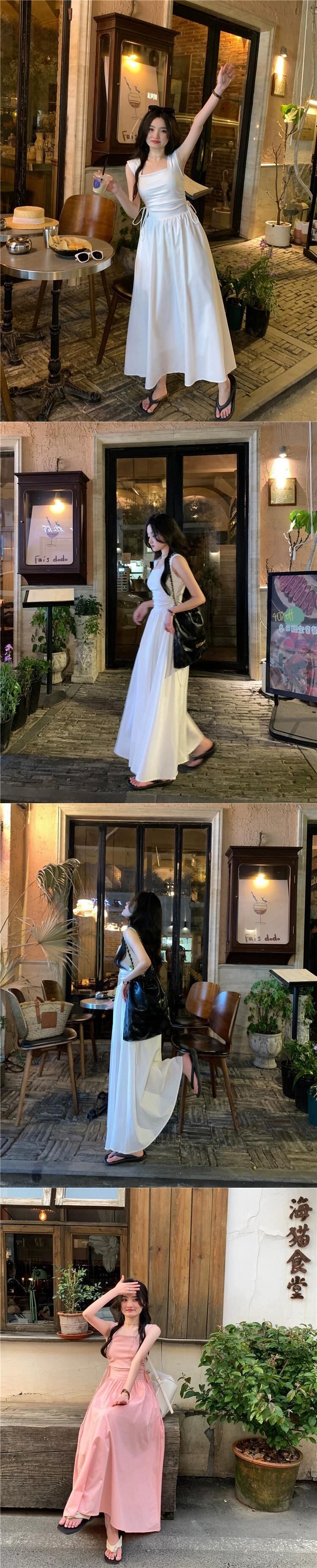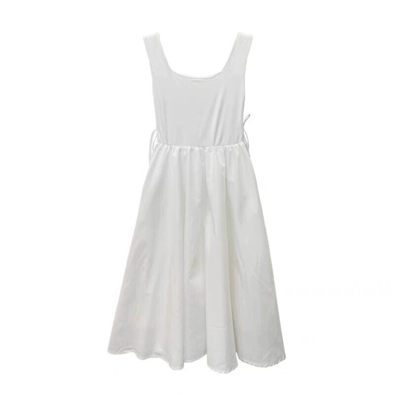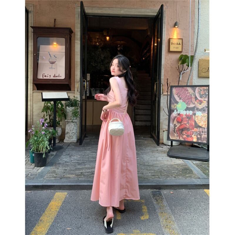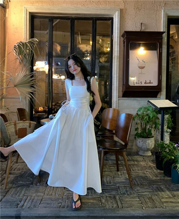 気質ヘップバーンスクエアネックノースリーブベストドレス女性の夏 2023 スタイルウエストスリム巾着スプライシングスカート サマー 夏物 スクウェア 0921946387932866
