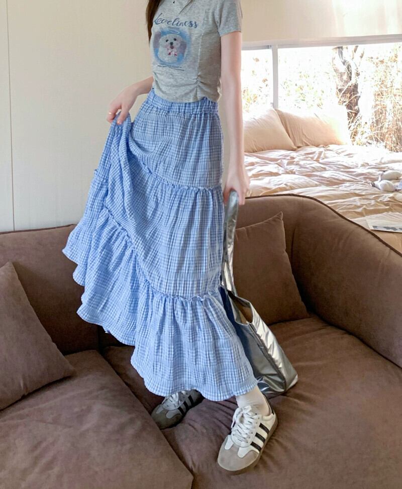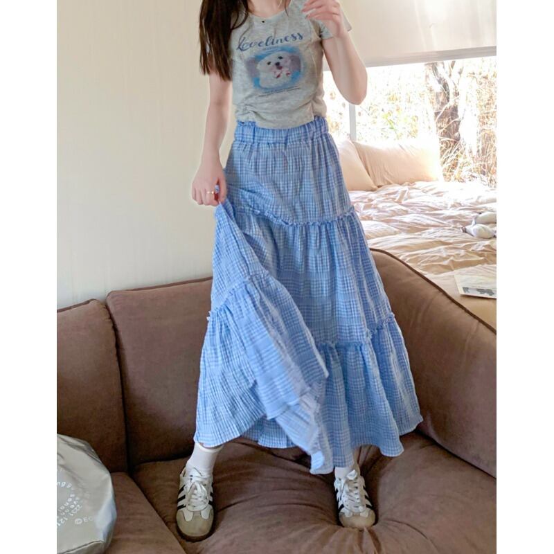 ブルーチェック柄ハイウエストスカート女性夏 2023 新年齢削減多目的痩身ミッドレングス A ラインスカート サマー 夏物 Aライン 0921992910752196